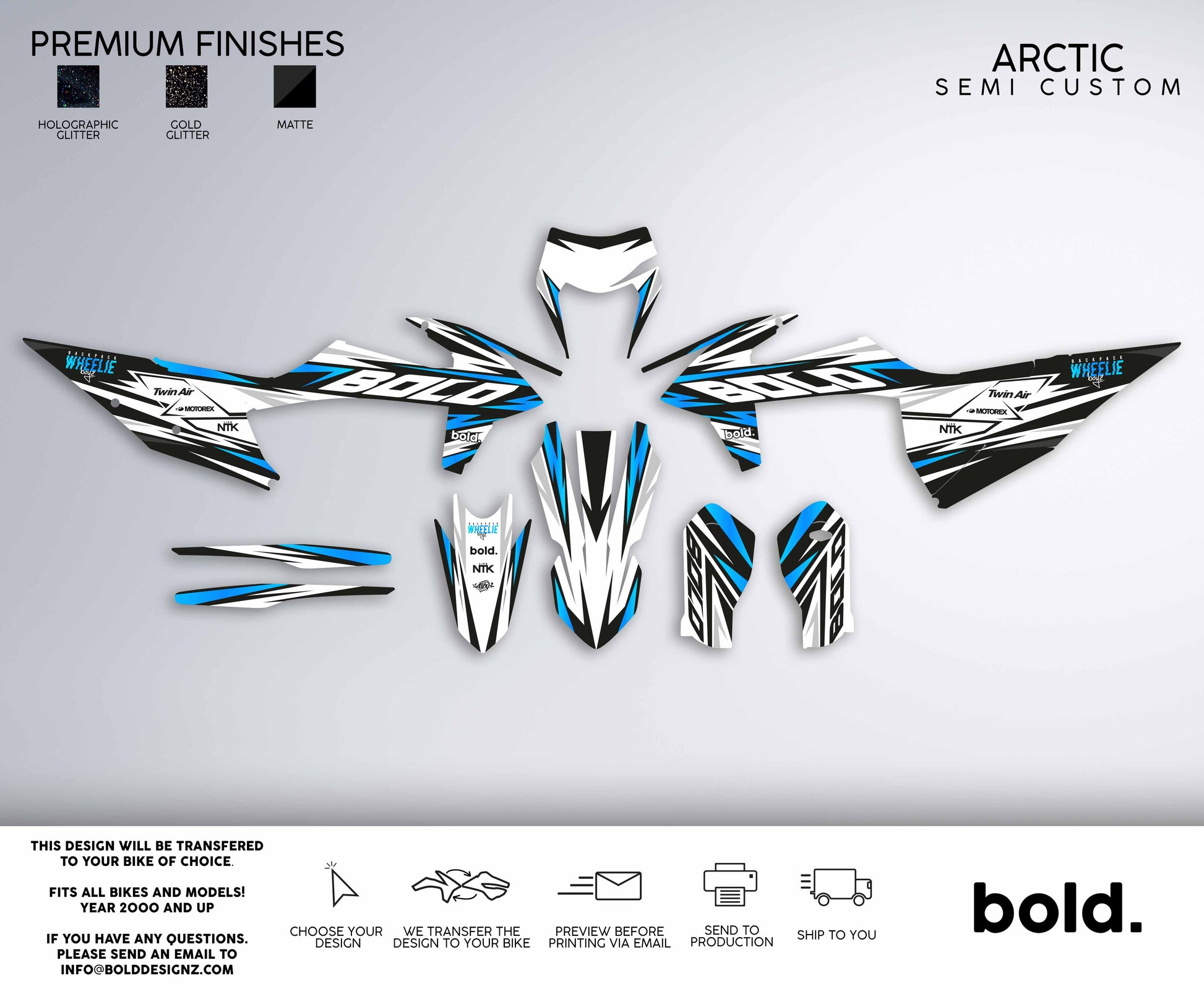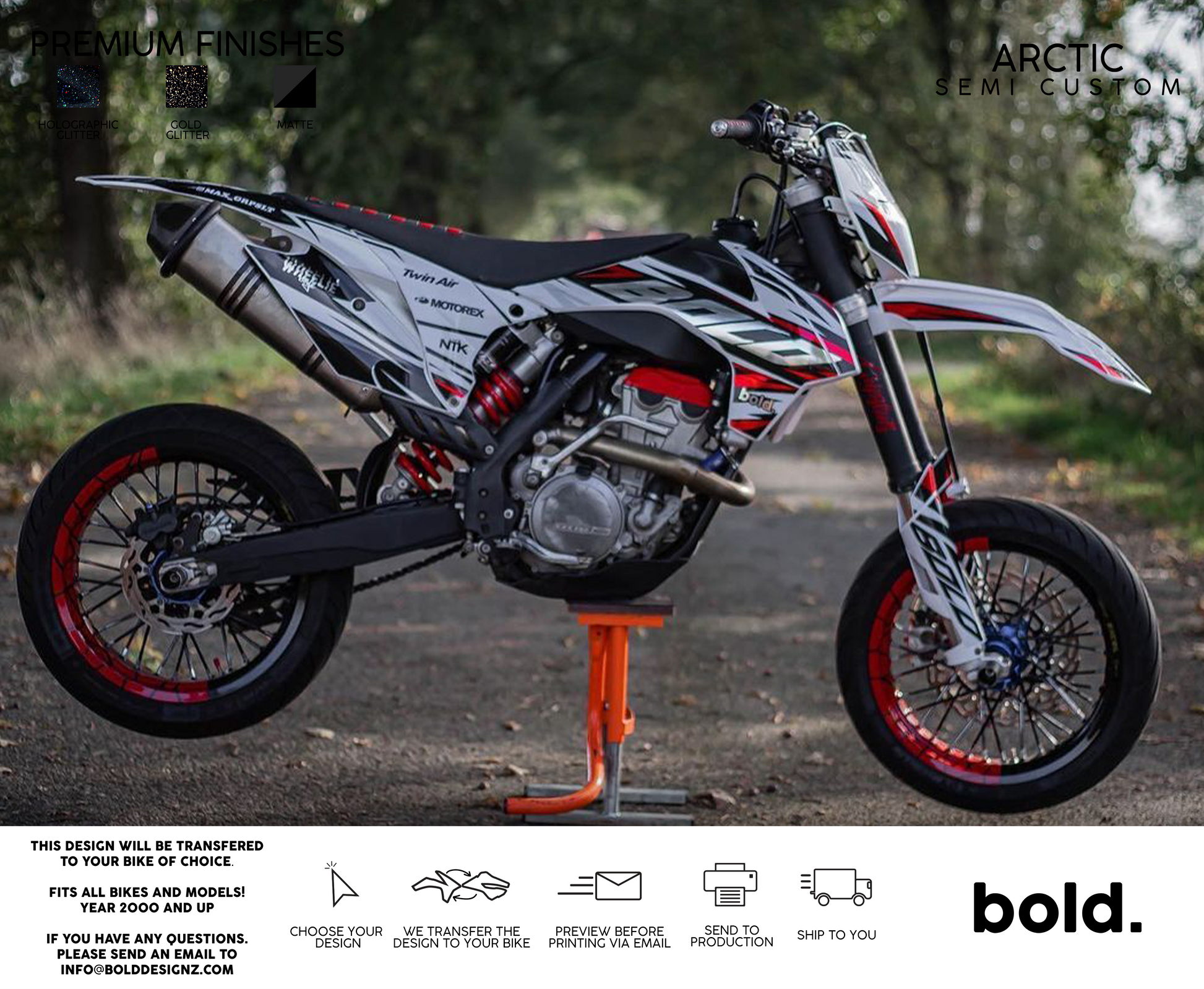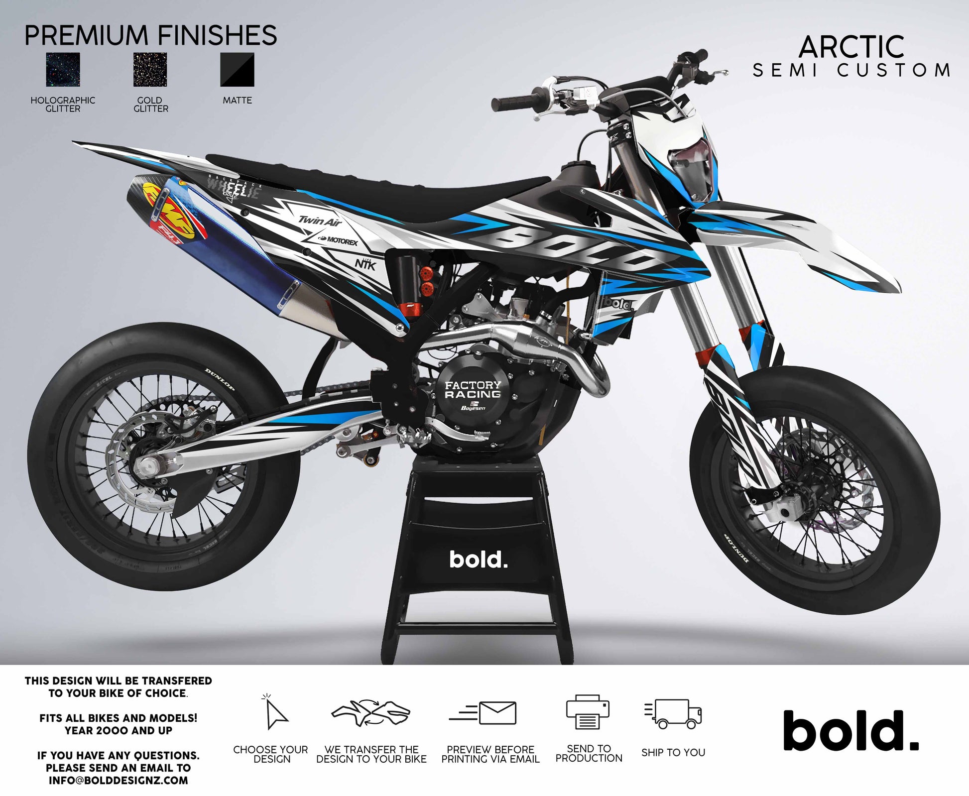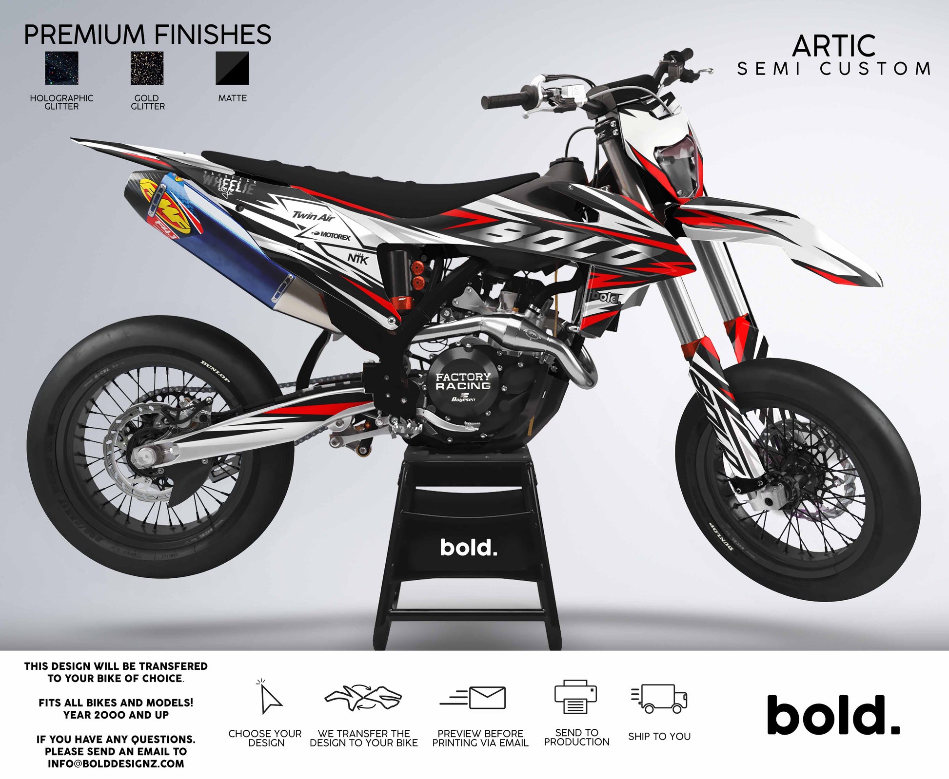 Your graphics will resist scratches, fading, and peeling, ensuring your bike maintains its head-turning looks for years to come. Don't settle for ordinary; embrace the extraordinary. Get your Bolddesignz Supermoto Semi-Custom Graphics and experience the thrill of riding a truly bold and unique bike.