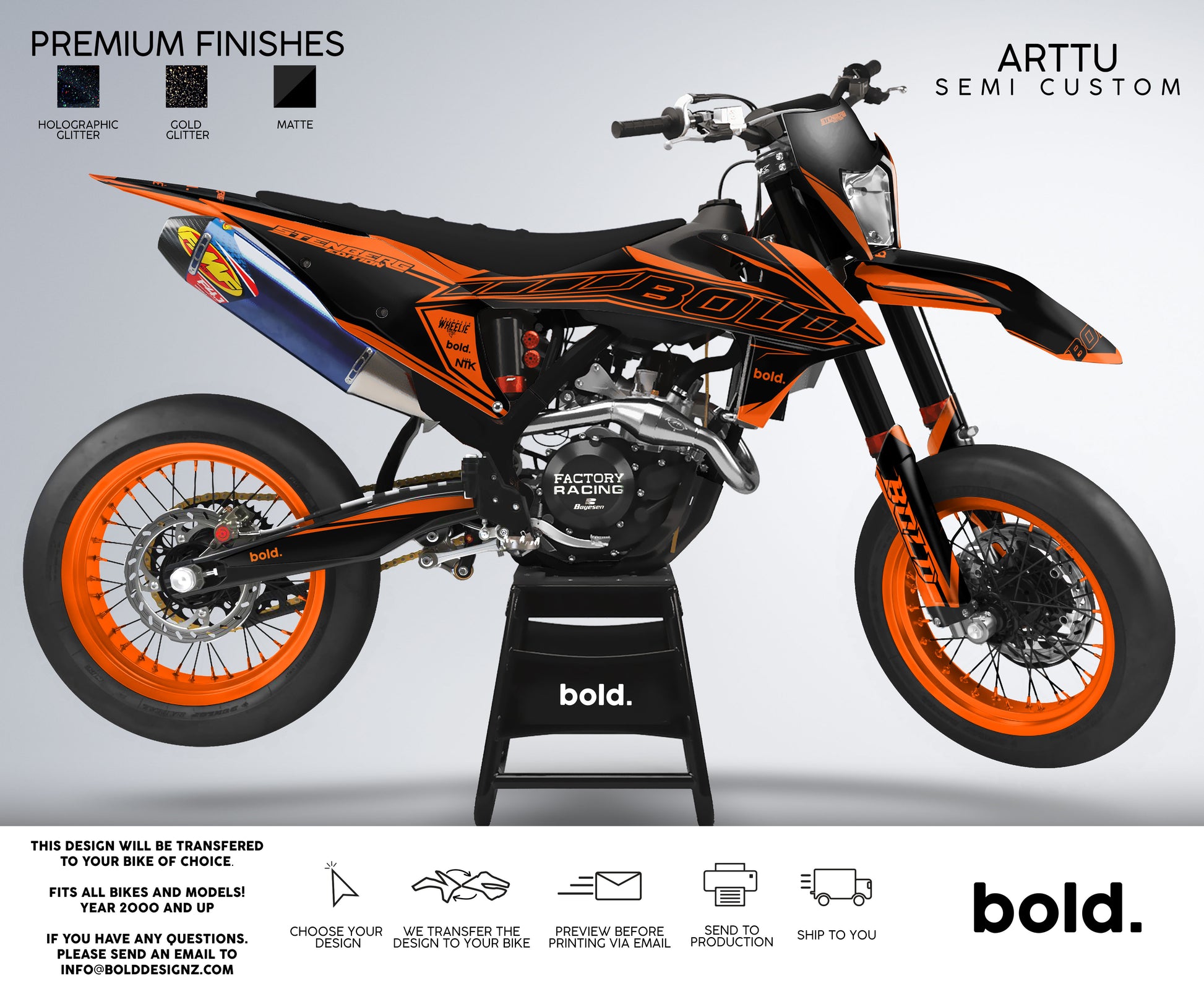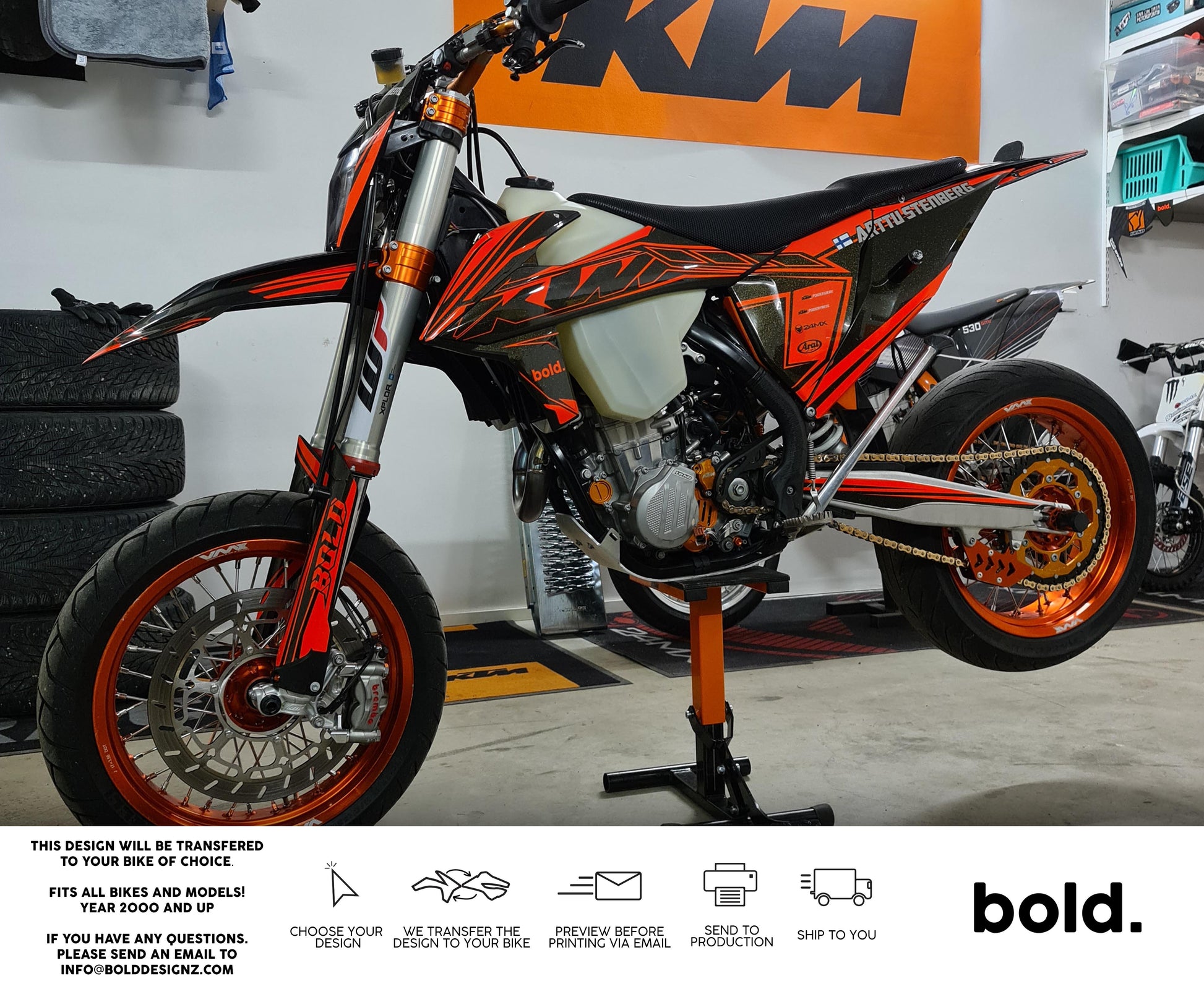 Your graphics will resist scratches, fading, and peeling, ensuring your bike maintains its head-turning looks for years to come. Don't settle for ordinary; embrace the extraordinary. Get your Bolddesignz Supermoto Semi-Custom Graphics and experience the thrill of riding a truly bold and unique bike.