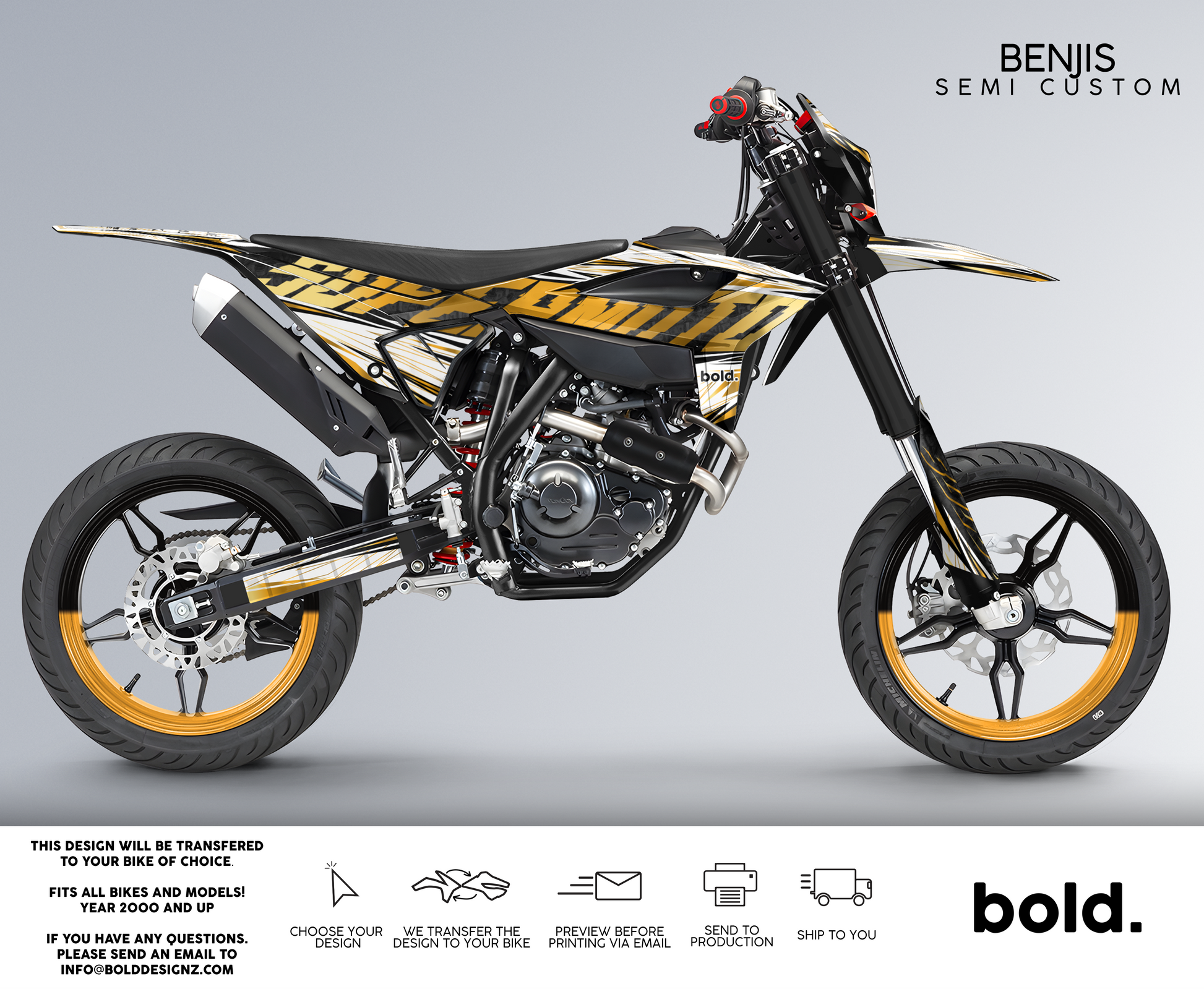 Your graphics will resist scratches, fading, and peeling, ensuring your bike maintains its head-turning looks for years to come. Don't settle for ordinary; embrace the extraordinary. Get your Bolddesignz Supermoto Semi-Custom Graphics and experience the thrill of riding a truly bold and unique bike.