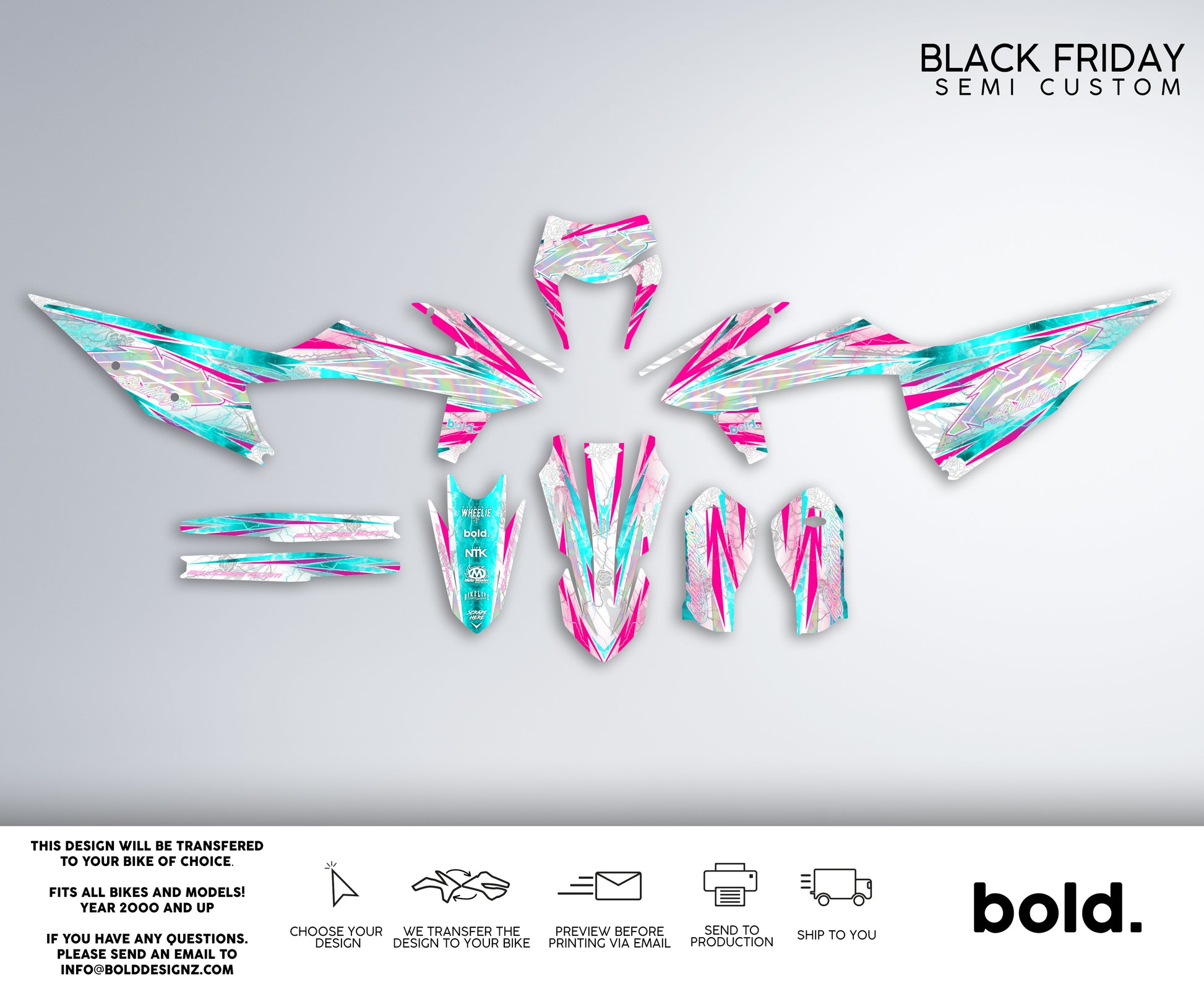 Your graphics will resist scratches, fading, and peeling, ensuring your bike maintains its head-turning looks for years to come. Don't settle for ordinary; embrace the extraordinary. Get your Bolddesignz Supermoto Semi-Custom Graphics and experience the thrill of riding a truly bold and unique bike.