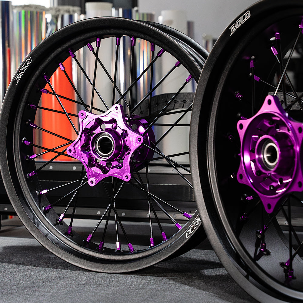 The bold. PURPLE v2 - Supermoto Wheelset gives you the control and confidence to ride harder, corner faster, and stand out everywhere you go. Each set is crafted to match perfectly with your setup - making your supermoto wheels look unique. Get a full customization with bold. PURPLE v2 - Supermoto Wheelset - as a part of our lineup of premium supermoto rims, and bold wheel designs trusted by riders worldwide.