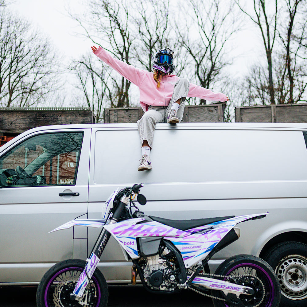 Explore our full collection of supermoto hoodies, motorcycle t-shirts and dirt bike hoodies, created for those who live and breathe moto cross culture. Whether you prefer minimal designs or bold statement pieces, the BPWB Light Pink Honk 4 Wheelie Hoodie (oversize fit) is designed to move with you – and stand out while doing it.