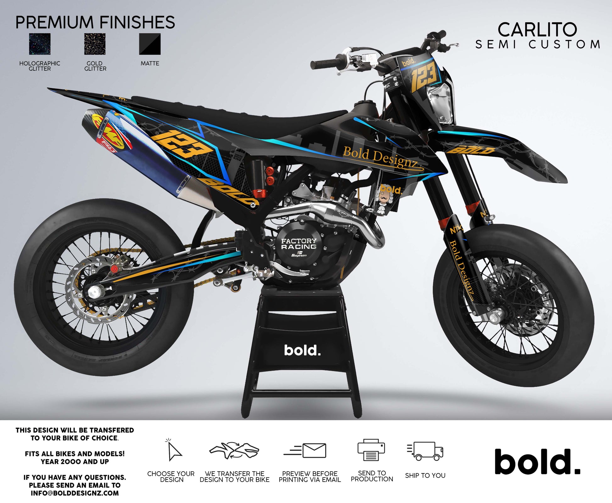 Transform your supermoto with Bolddesignz superior Supermoto Semi Custom Graphics. These are not just decals; they are a visual transformation, and a perfect way to personalize your bike. Build the supermoto from your dreams.