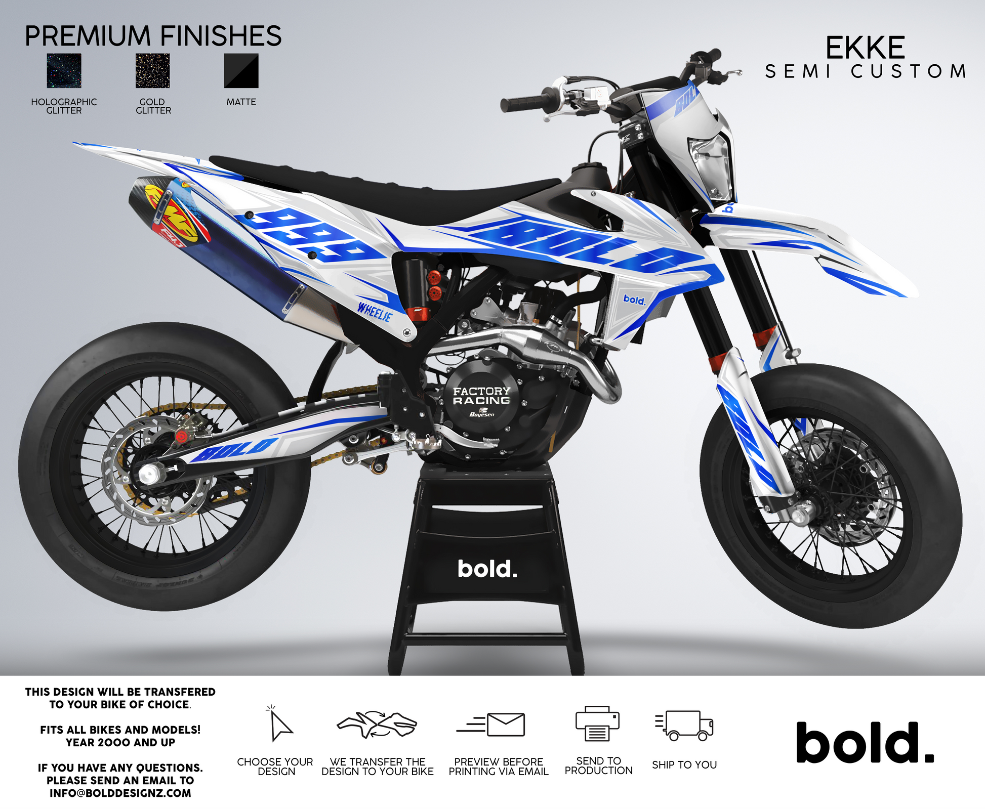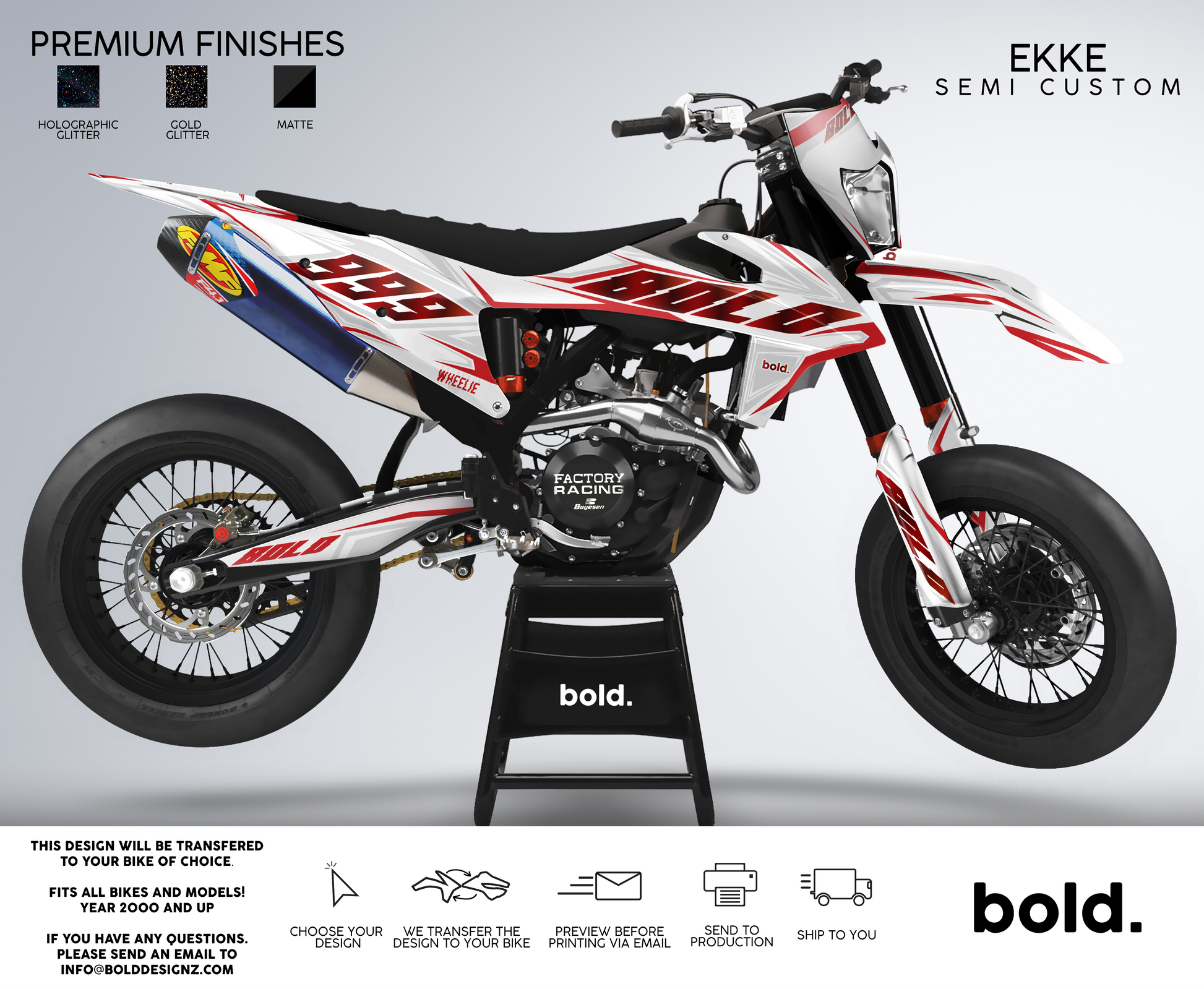 Transform your supermoto with Bolddesignz superior Supermoto Semi Custom Graphics. These are not just decals; they are a visual transformation, and a perfect way to personalize your bike. Build the supermoto from your dreams.