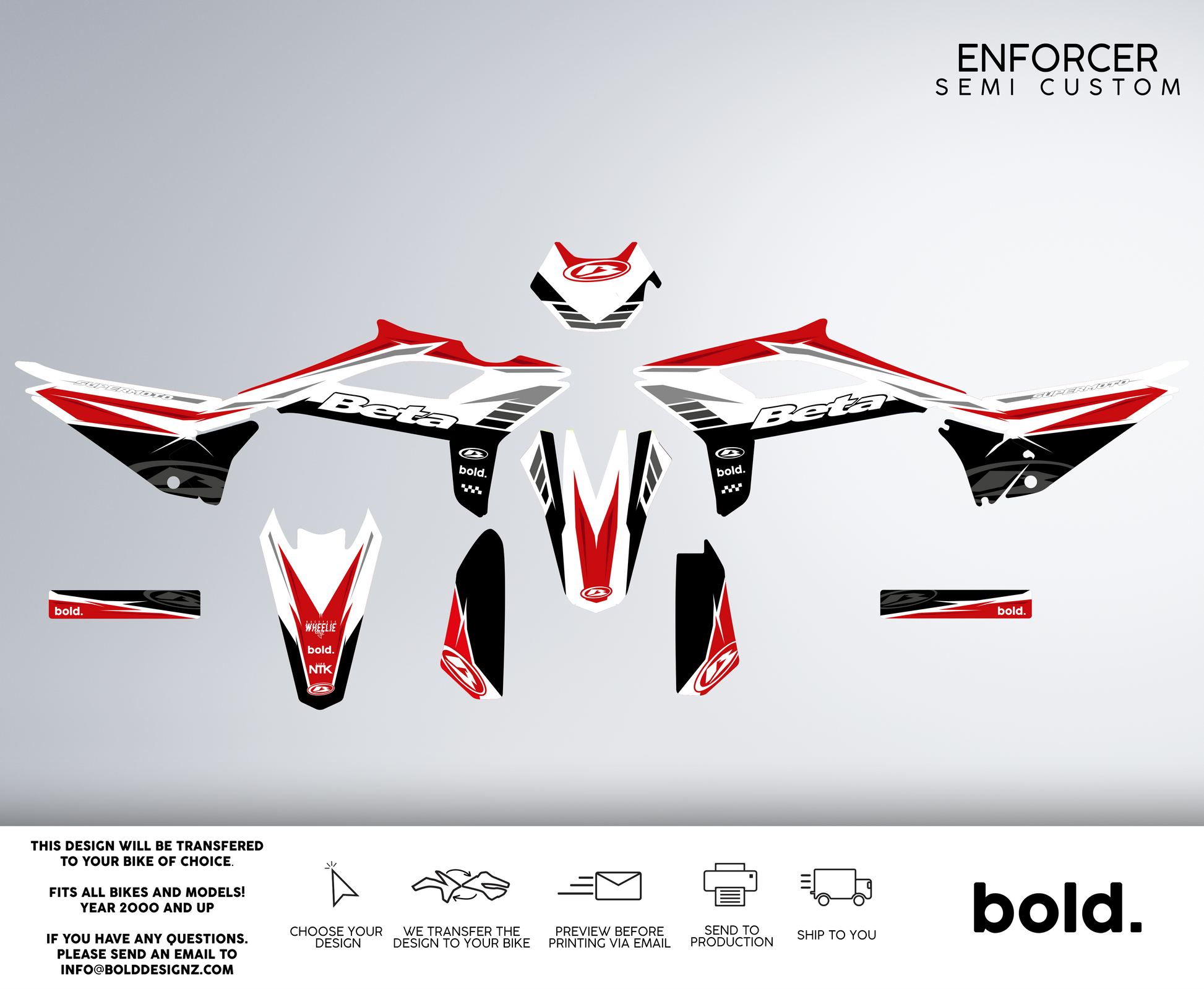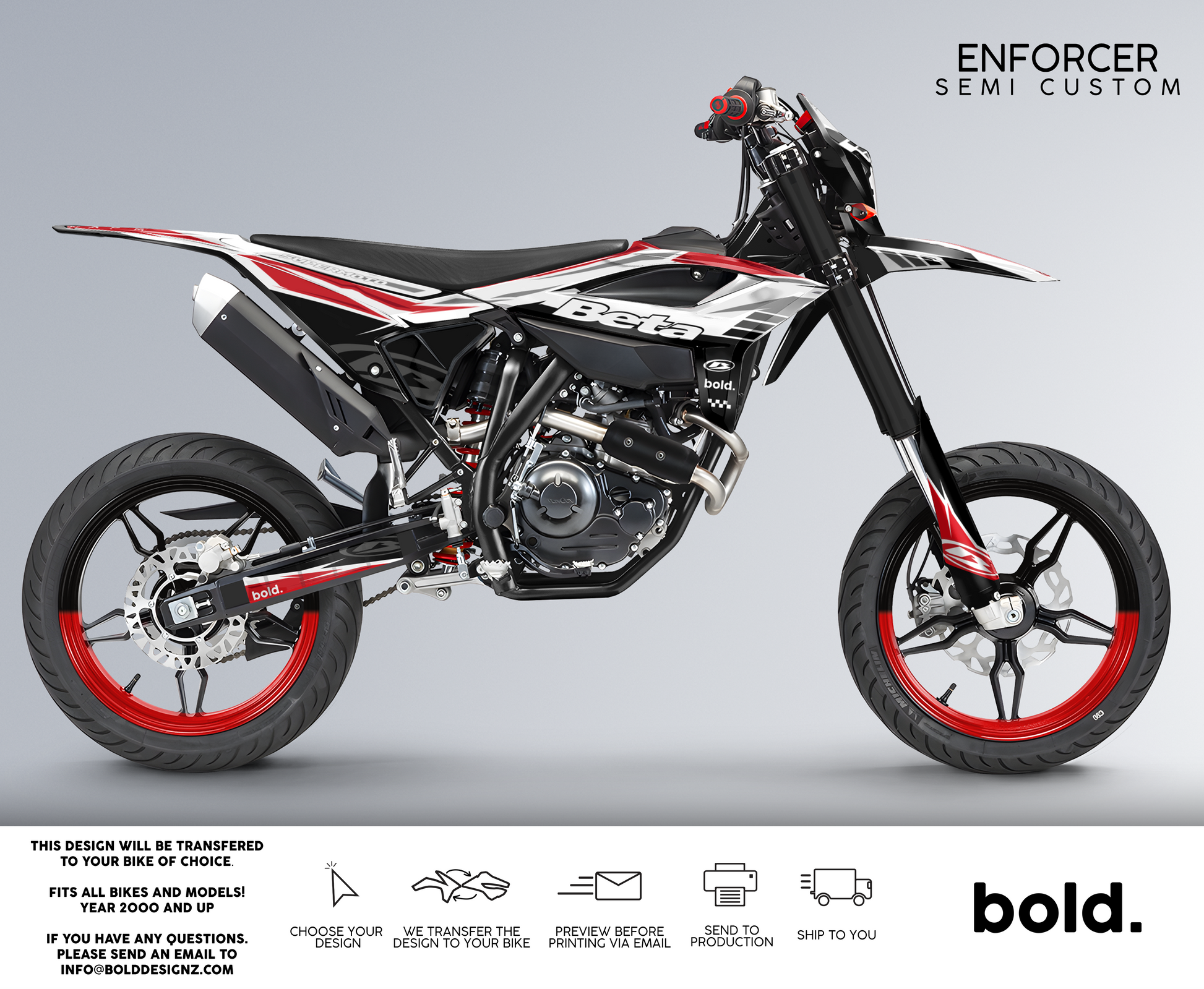 Your graphics will resist scratches, fading, and peeling, ensuring your bike maintains its head-turning looks for years to come. Don't settle for ordinary; embrace the extraordinary. Get your Bolddesignz Supermoto Semi-Custom Graphics and experience the thrill of riding a truly bold and unique bike.