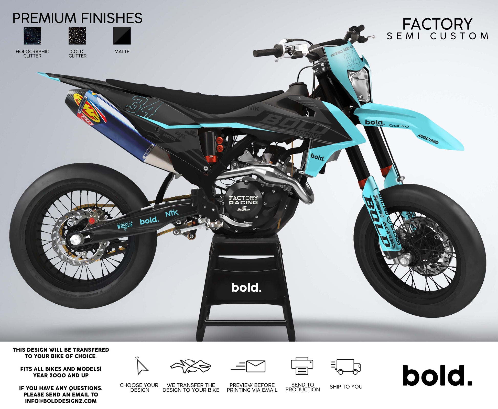 Your graphics will resist scratches, fading, and peeling, ensuring your bike maintains its head-turning looks for years to come. Don't settle for ordinary; embrace the extraordinary. Get your Bolddesignz Supermoto Semi-Custom Graphics and experience the thrill of riding a truly bold and unique bike.