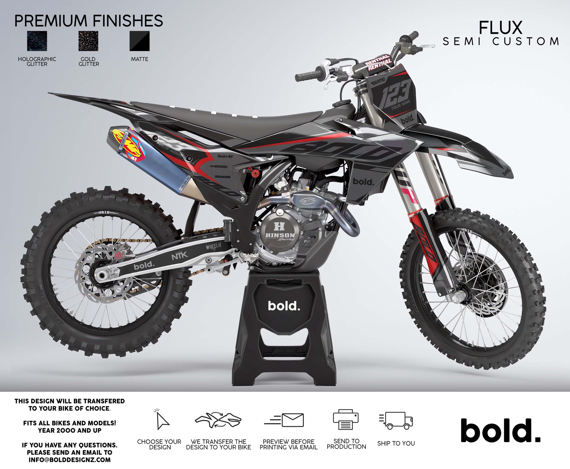 Your graphics will resist scratches, fading, and peeling, ensuring your dirt bike maintains its head-turning looks for years to come. Don't settle for ordinary; embrace the extraordinary. Get your Bolddesignz Motocross Semi Custom Graphics and experience the thrill of riding a truly bold and unique bike.