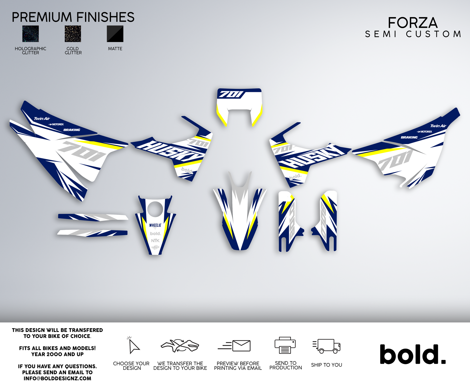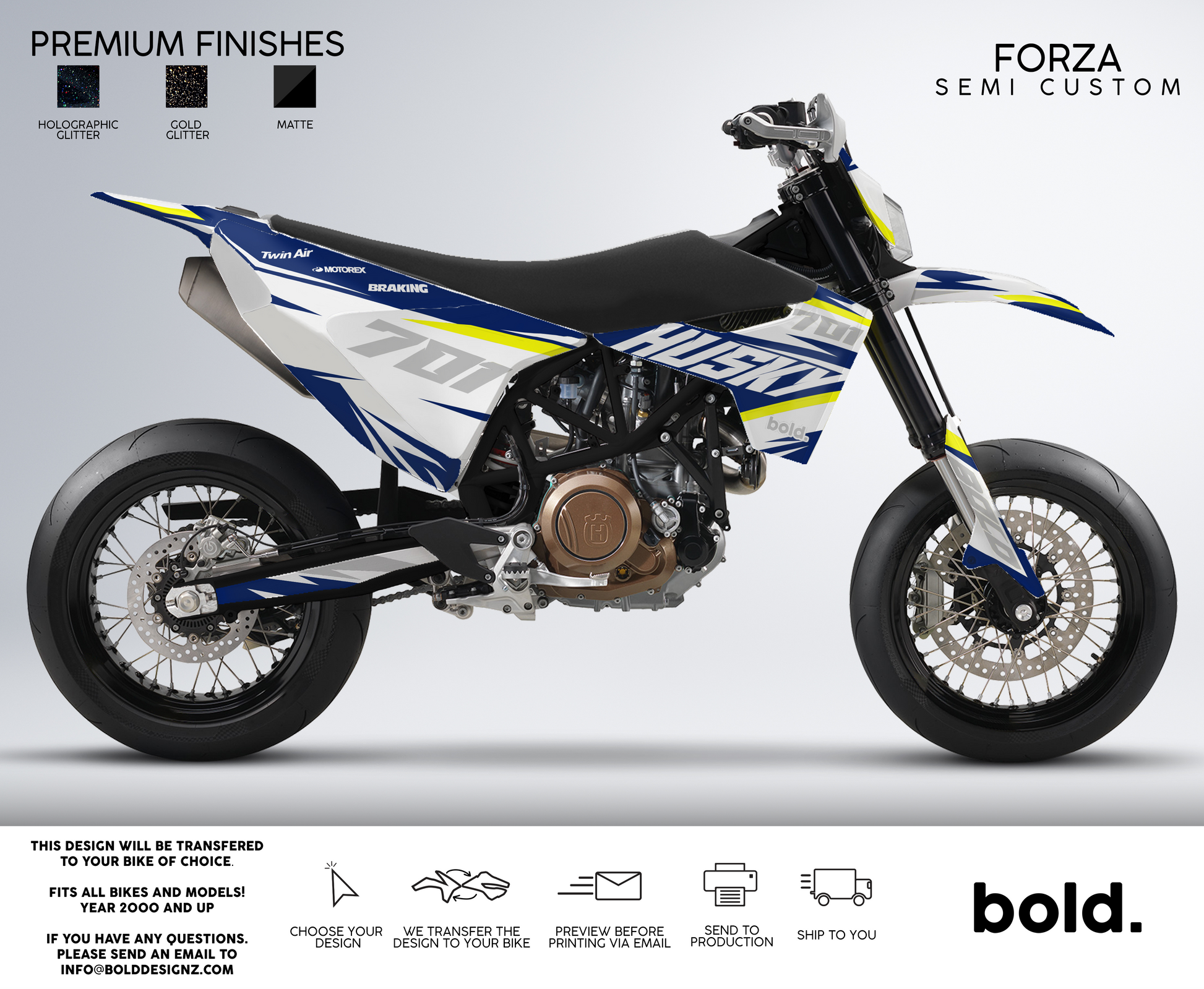 Your graphics will resist scratches, fading, and peeling, ensuring your bike maintains its head-turning looks for years to come. Don't settle for ordinary; embrace the extraordinary. Get your Bolddesignz Supermoto Semi-Custom Graphics and experience the thrill of riding a truly bold and unique bike.
