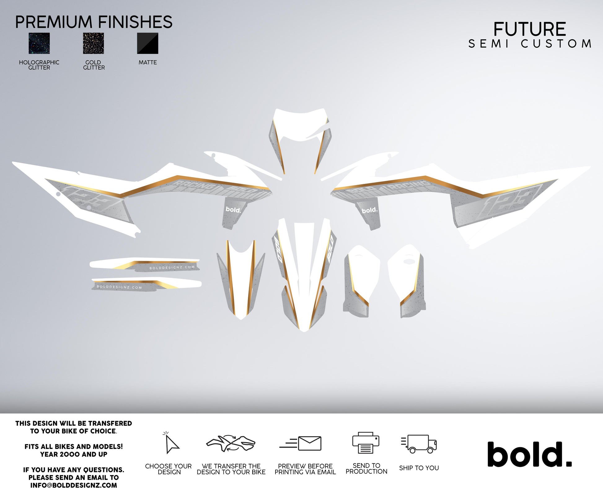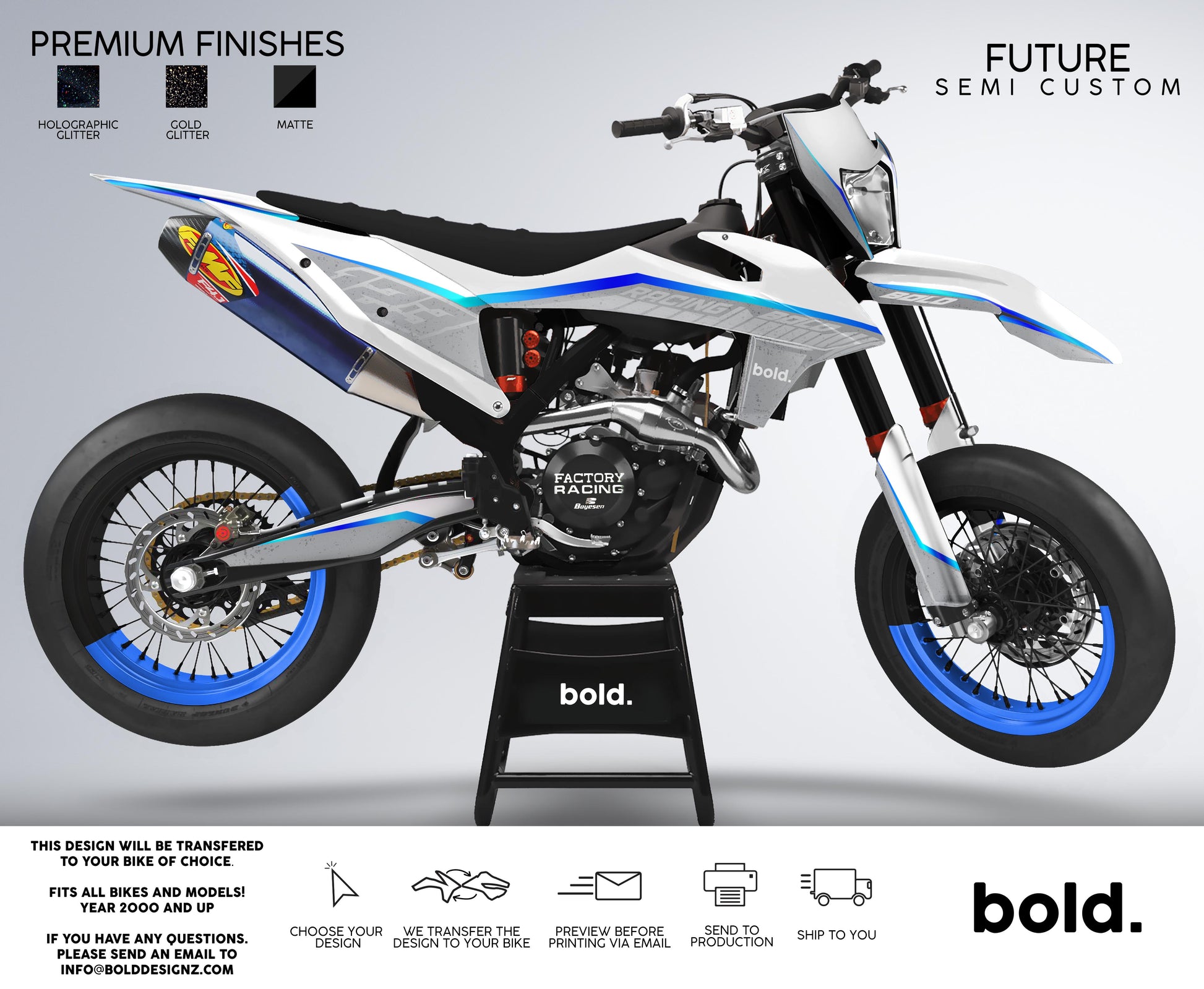Your graphics will resist scratches, fading, and peeling, ensuring your bike maintains its head-turning looks for years to come. Don't settle for ordinary; embrace the extraordinary. Get your Bolddesignz Supermoto Semi-Custom Graphics and experience the thrill of riding a truly bold and unique bike.