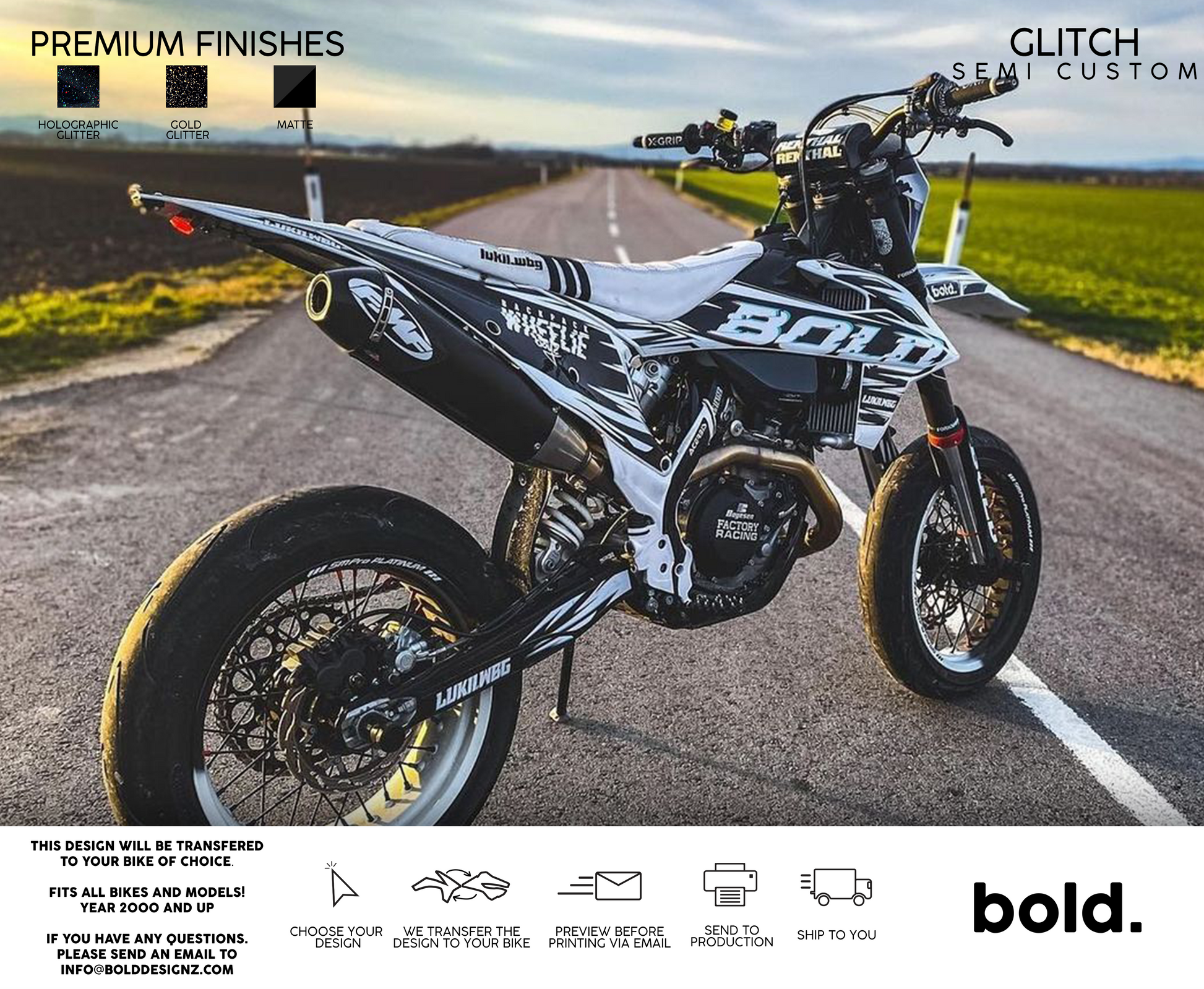Your graphics will resist scratches, fading, and peeling, ensuring your bike maintains its head-turning looks for years to come. Don't settle for ordinary; embrace the extraordinary. Get your Bolddesignz Supermoto Semi-Custom Graphics and experience the thrill of riding a truly bold and unique bike.