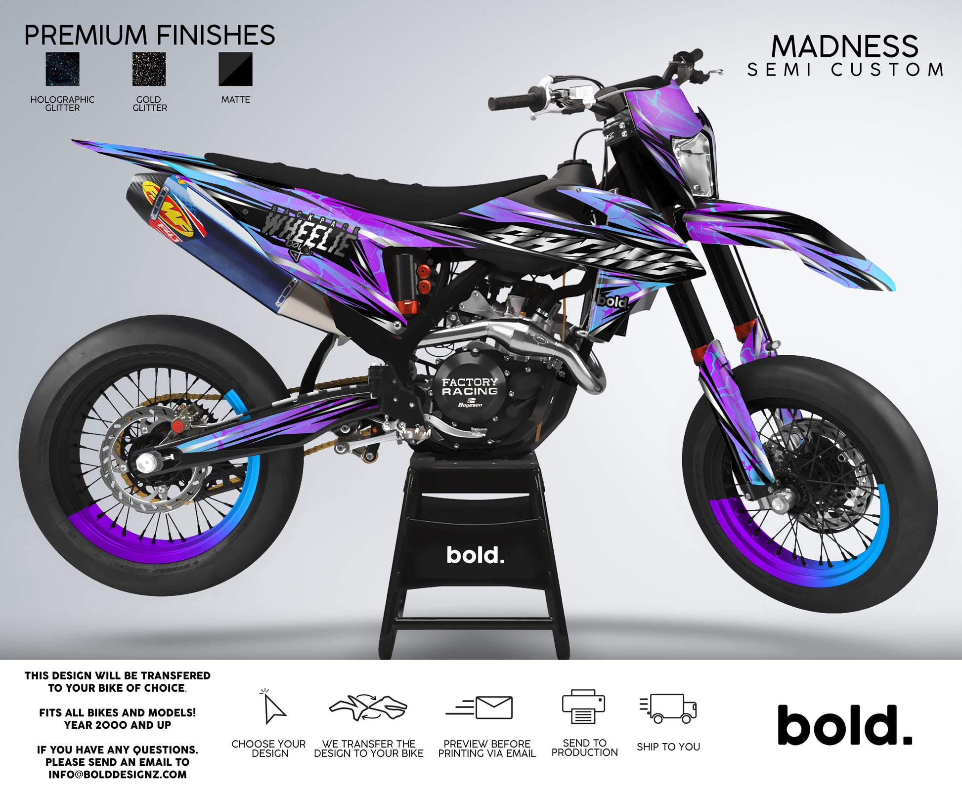 Your graphics will resist scratches, fading, and peeling, ensuring your bike maintains its head-turning looks for years to come. Don't settle for ordinary; embrace the extraordinary. Get your Bolddesignz Supermoto Semi-Custom Graphics and experience the thrill of riding a truly bold and unique bike.