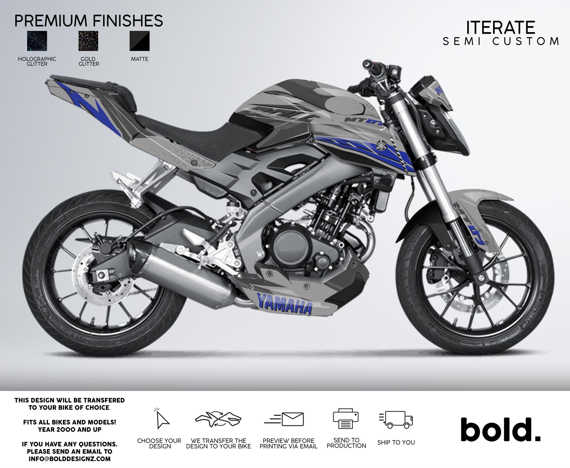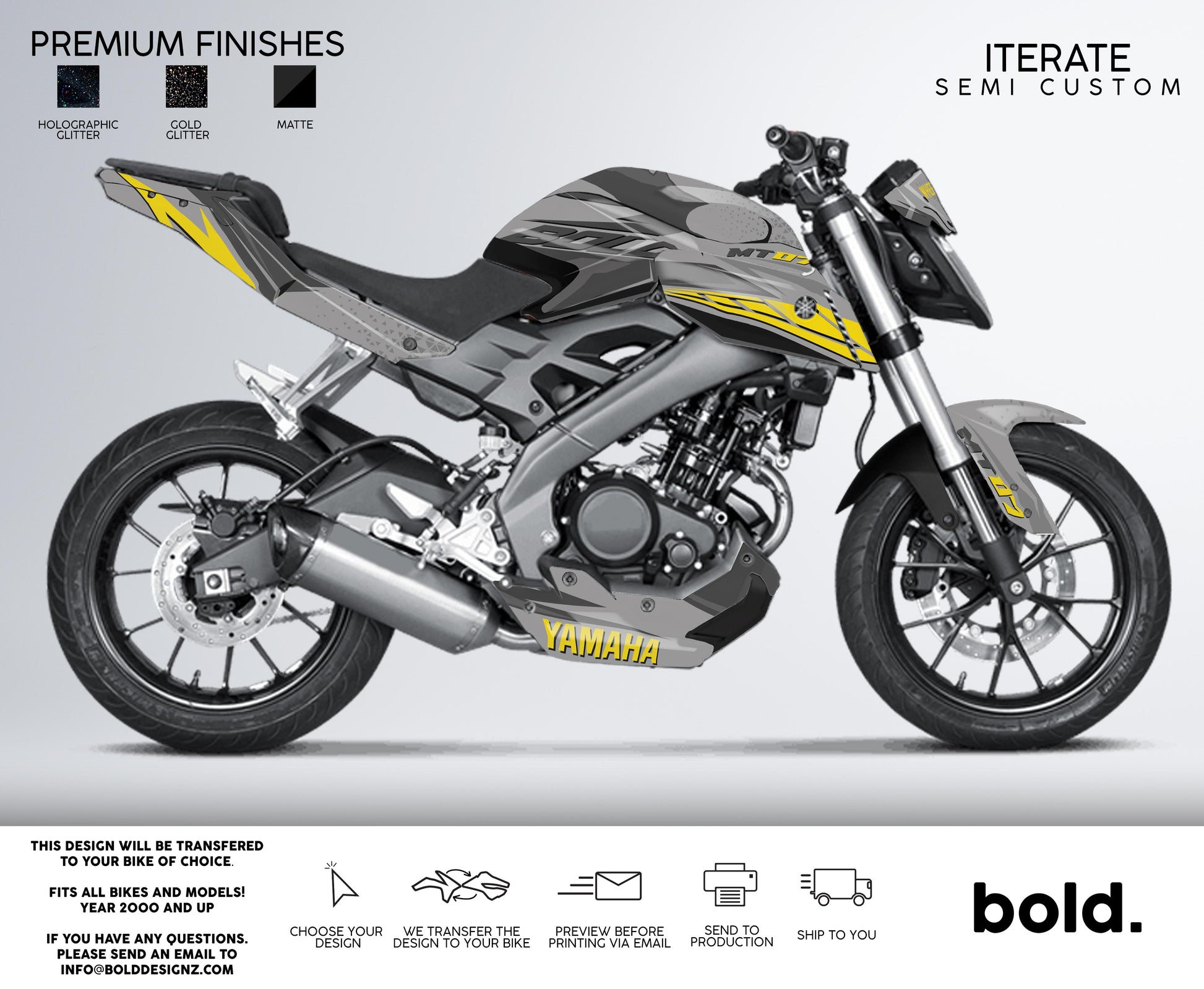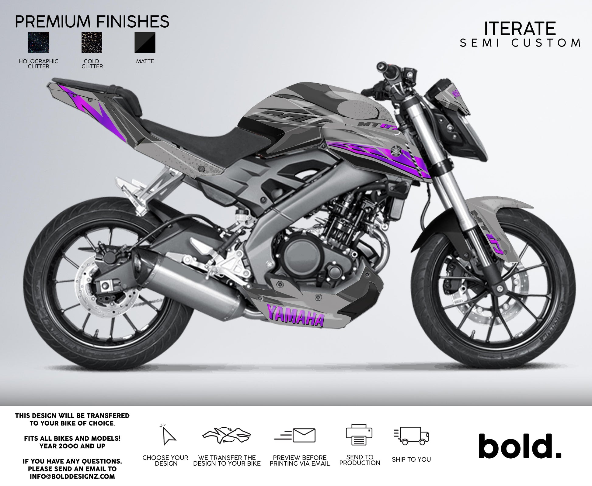 Your graphics will resist scratches, fading, and peeling, ensuring your bike maintains its head-turning looks for years to come.Don't settle for ordinary; embrace the extraordinary. Get your Bolddesignz Street Bike Semi Custom Graphics and experience the thrill of riding a truly bold and unique bike.