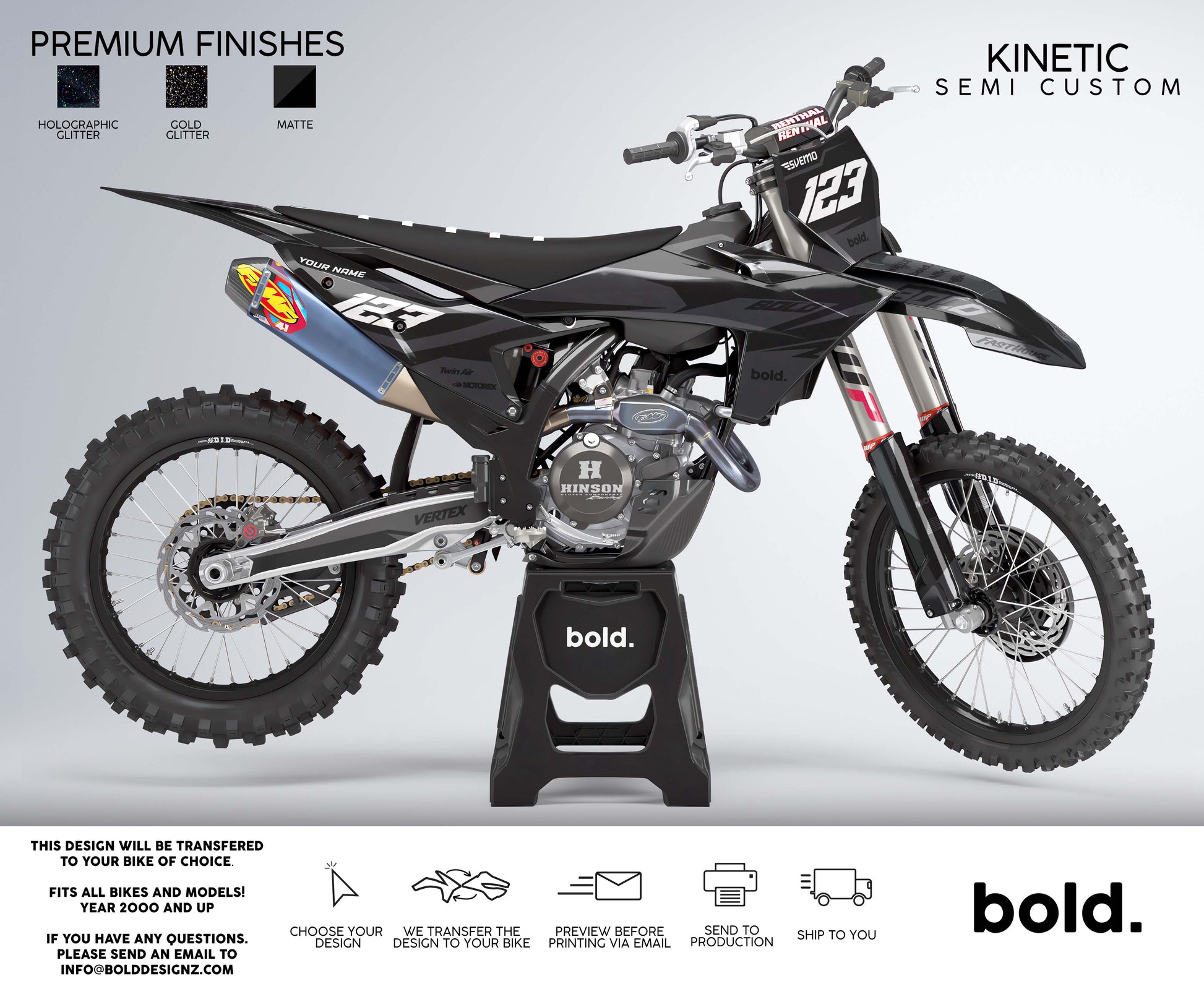 Your graphics will resist scratches, fading, and peeling, ensuring your dirt bike maintains its head-turning looks for years to come. Don't settle for ordinary; embrace the extraordinary. Get your Bolddesignz Motocross Semi Custom Graphics and experience the thrill of riding a truly bold and unique bike.