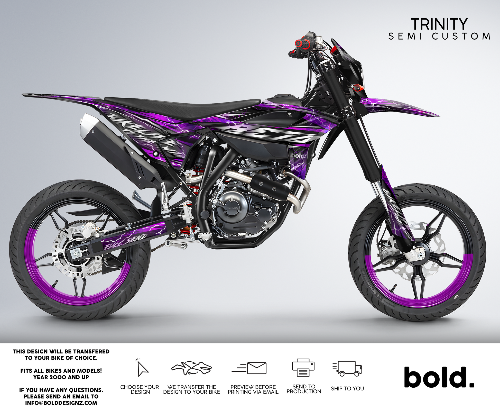 Your graphics will resist scratches, fading, and peeling, ensuring your bike maintains its head-turning looks for years to come. Don't settle for ordinary; embrace the extraordinary. Get your Bolddesignz Supermoto Semi-Custom Graphics and experience the thrill of riding a truly bold and unique bike.