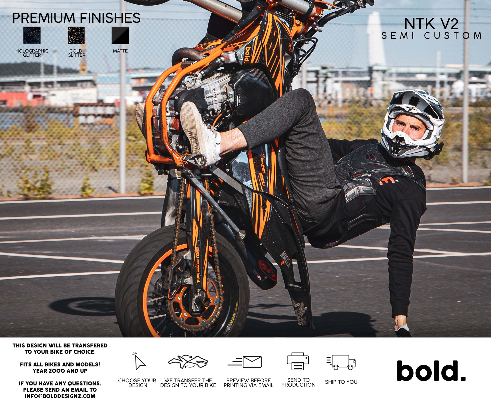 Your graphics will resist scratches, fading, and peeling, ensuring your bike maintains its head-turning looks for years to come. Don't settle for ordinary; embrace the extraordinary. Get your Bolddesignz Supermoto Semi-Custom Graphics and experience the thrill of riding a truly bold and unique bike.