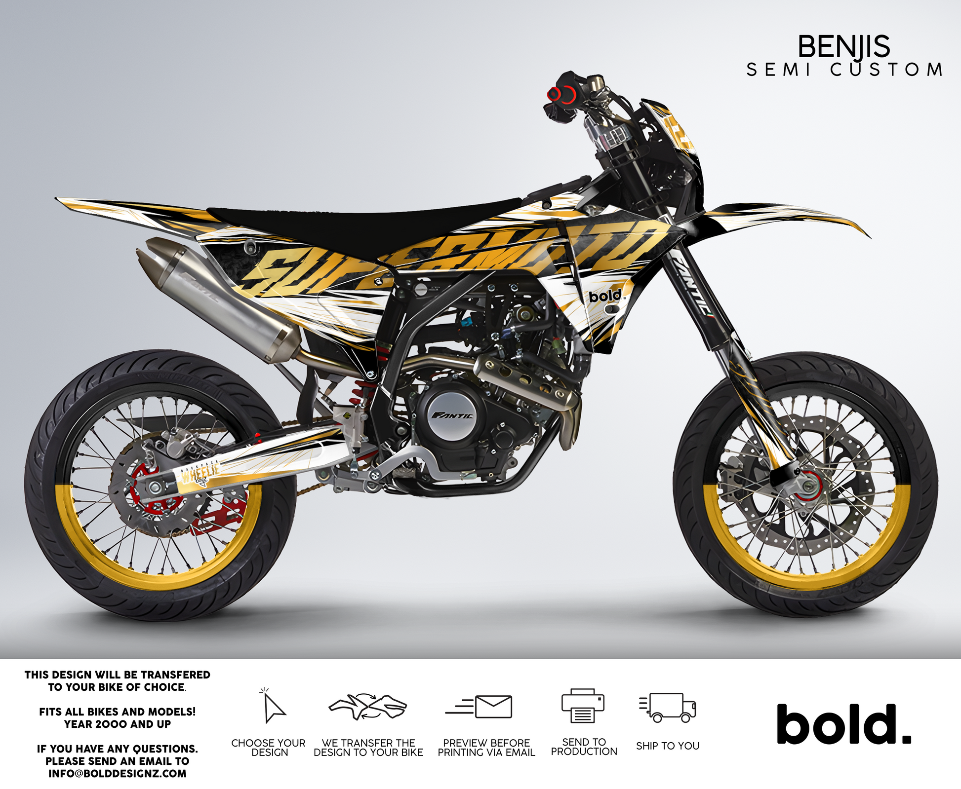 Transform your supermoto with Bolddesignz superior Supermoto Semi Custom Graphics. These are not just decals; they are a visual transformation, and a perfect way to personalize your bike. Build the supermoto from your dreams.