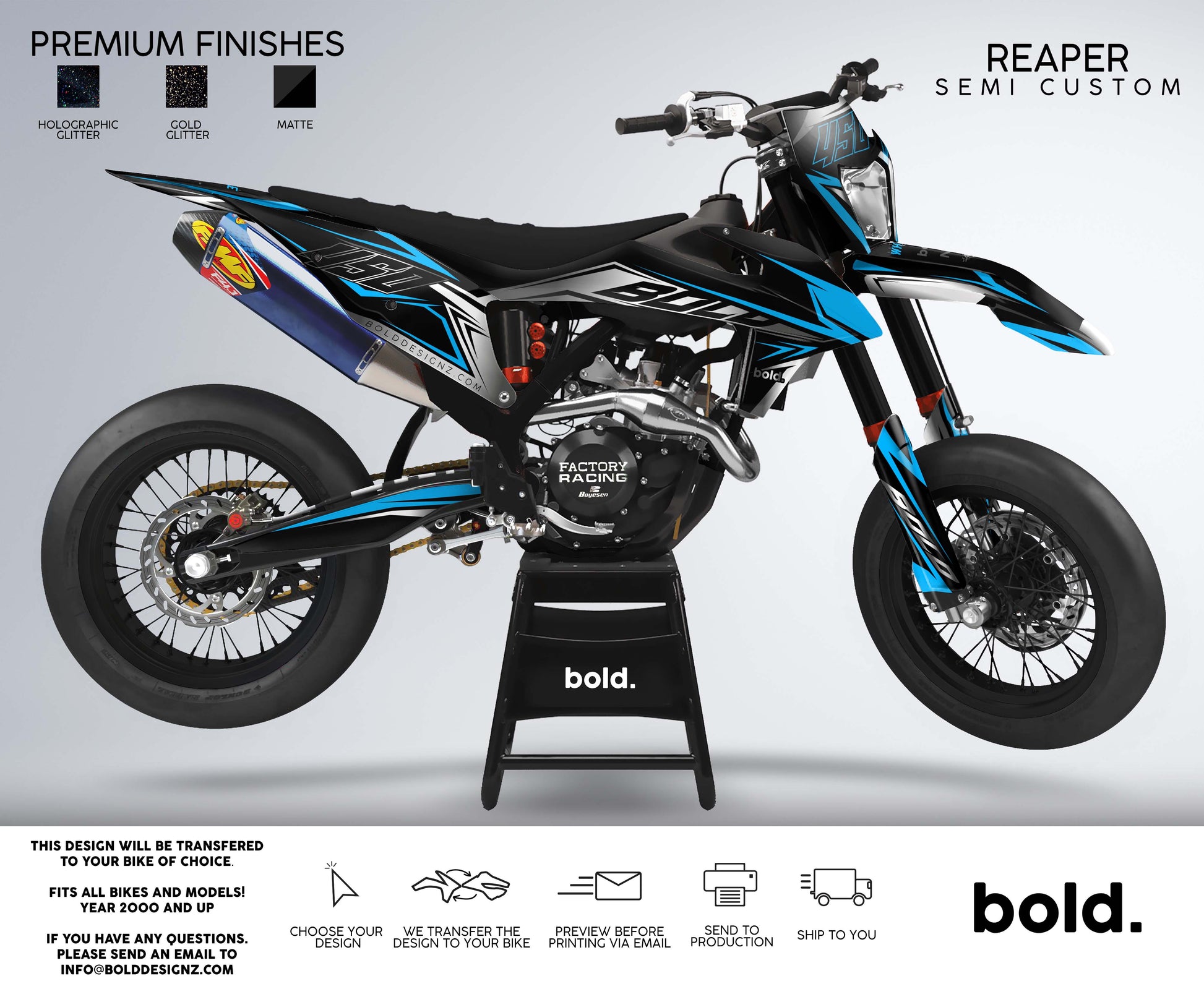 Your graphics will resist scratches, fading, and peeling, ensuring your bike maintains its head-turning looks for years to come. Don't settle for ordinary; embrace the extraordinary. Get your Bolddesignz Supermoto Semi-Custom Graphics and experience the thrill of riding a truly bold and unique bike.