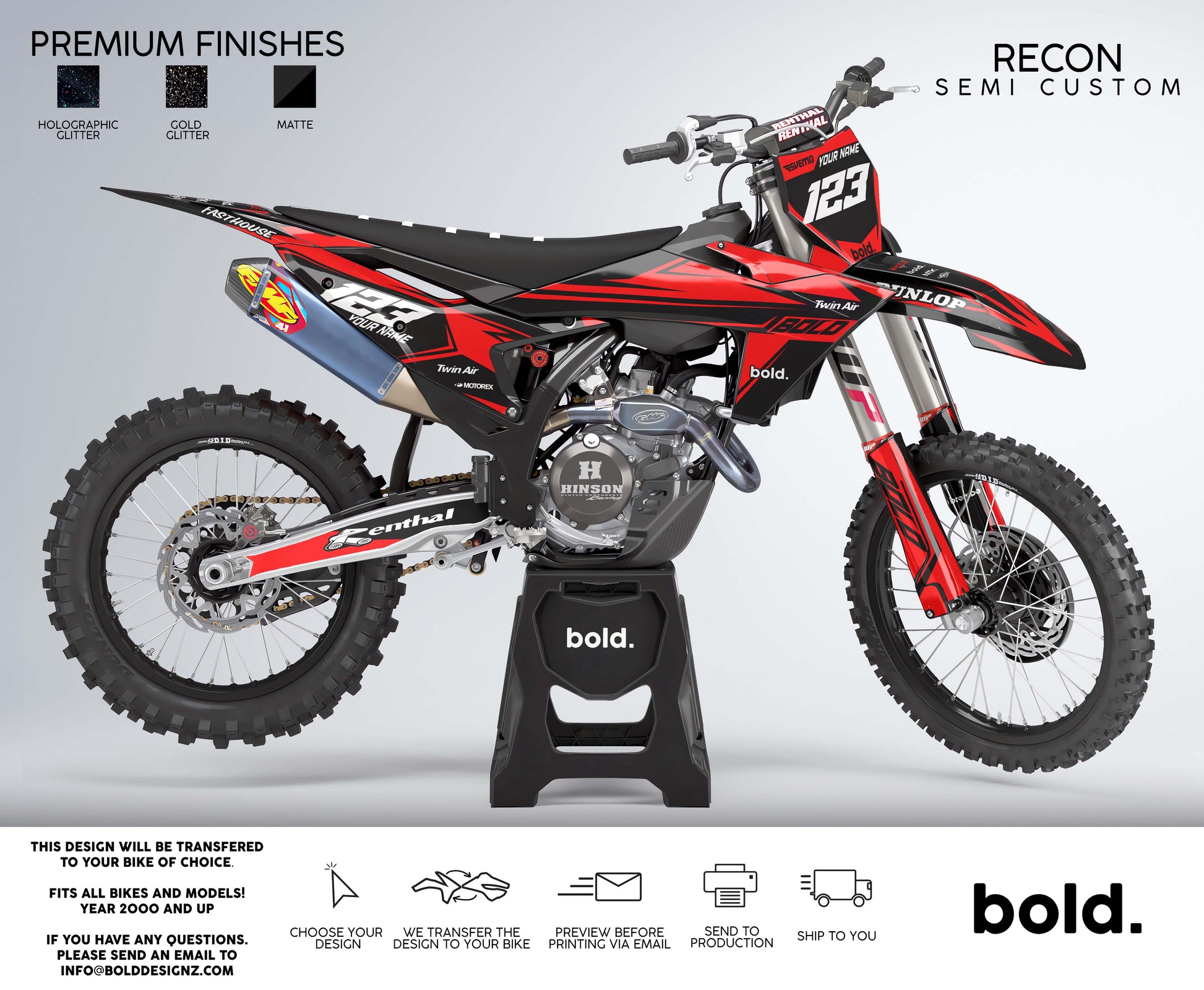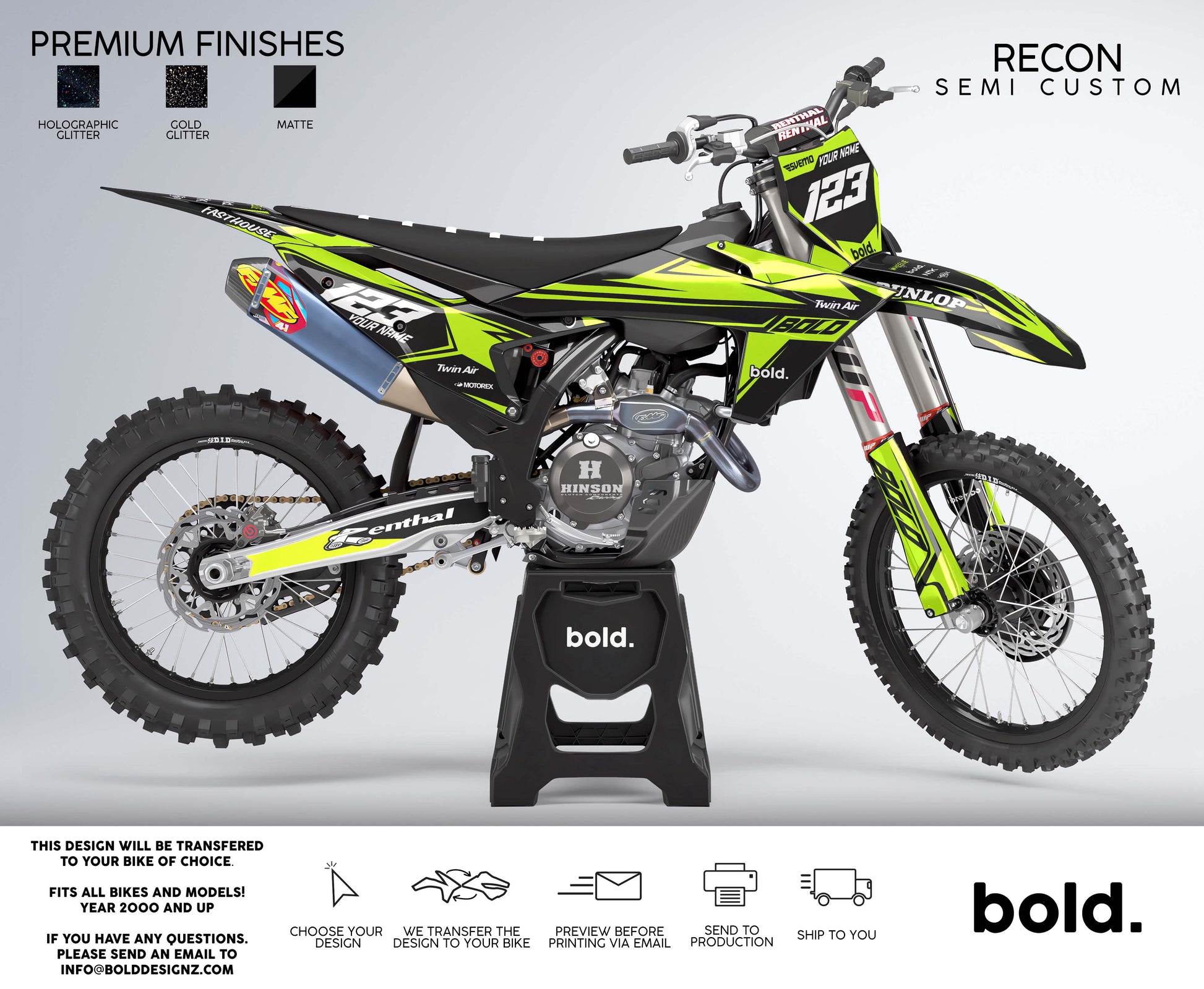 Your graphics will resist scratches, fading, and peeling, ensuring your dirt bike maintains its head-turning looks for years to come. Don't settle for ordinary; embrace the extraordinary. Get your Bolddesignz Motocross Semi Custom Graphics and experience the thrill of riding a truly bold and unique bike.
