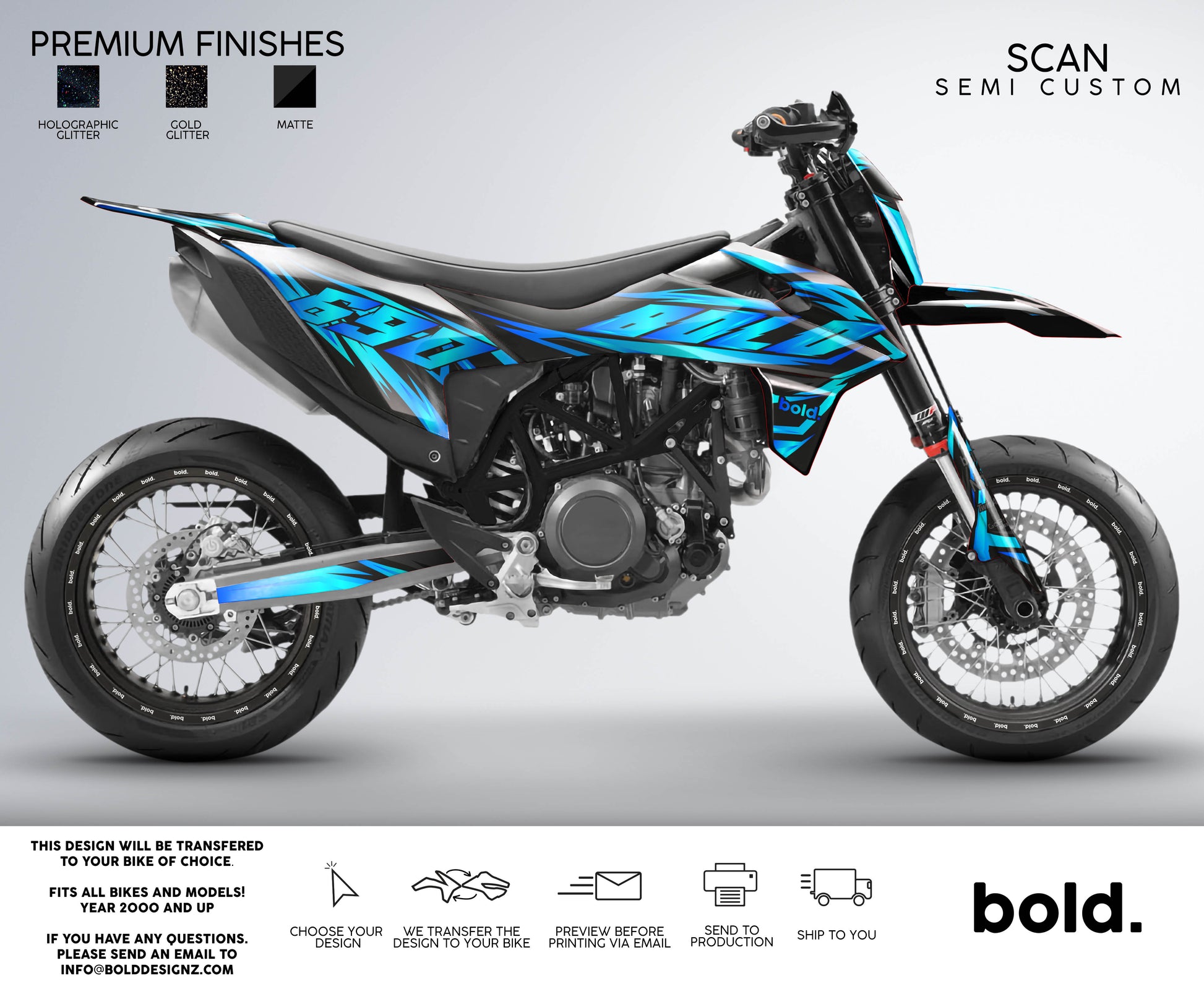 Your graphics will resist scratches, fading, and peeling, ensuring your bike maintains its head-turning looks for years to come. Don't settle for ordinary; embrace the extraordinary. Get your Bolddesignz Supermoto Semi-Custom Graphics and experience the thrill of riding a truly bold and unique bike.