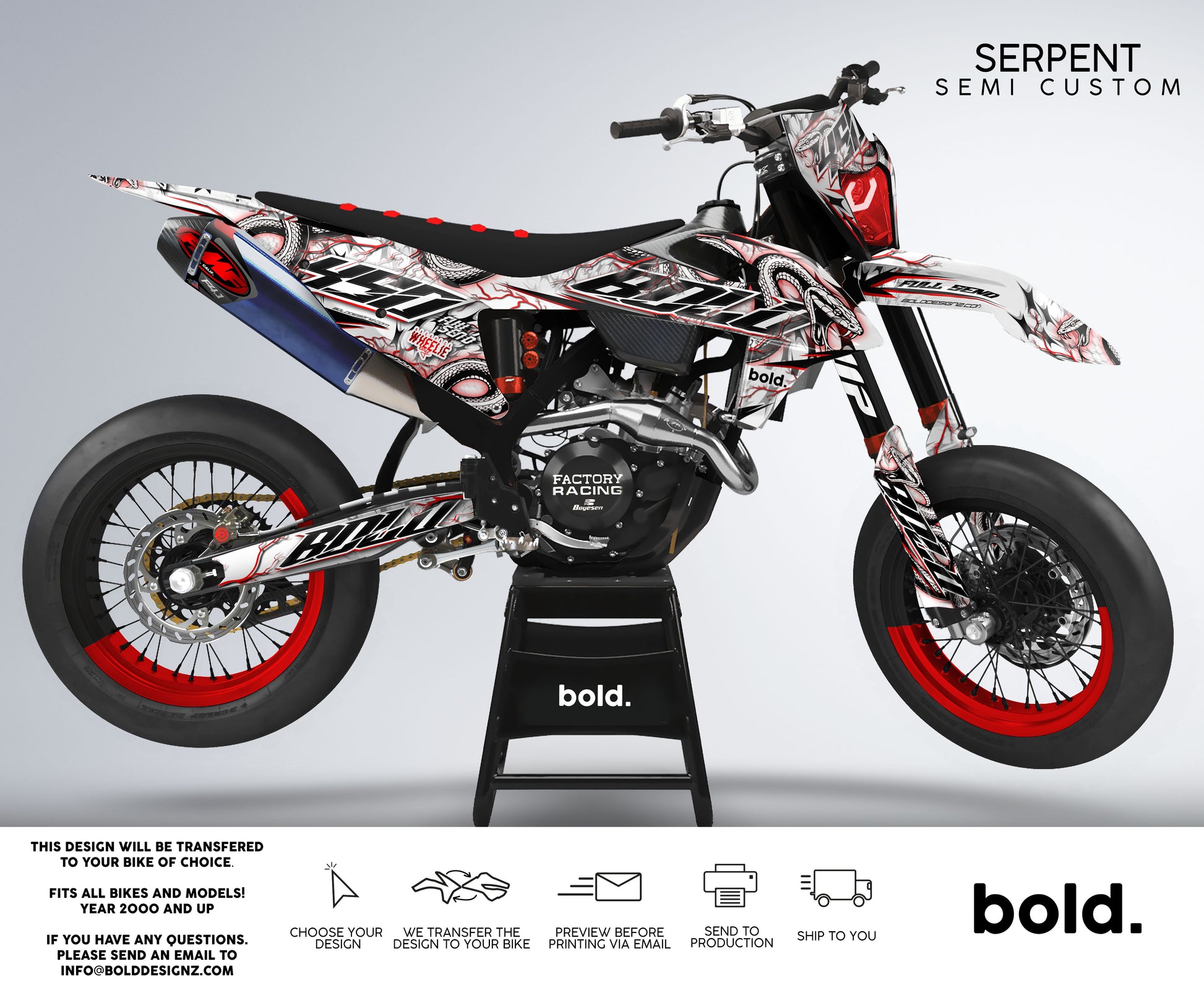 Your graphics will resist scratches, fading, and peeling, ensuring your bike maintains its head-turning looks for years to come. Don't settle for ordinary; embrace the extraordinary. Get your Bolddesignz Supermoto Semi-Custom Graphics and experience the thrill of riding a truly bold and unique bike.