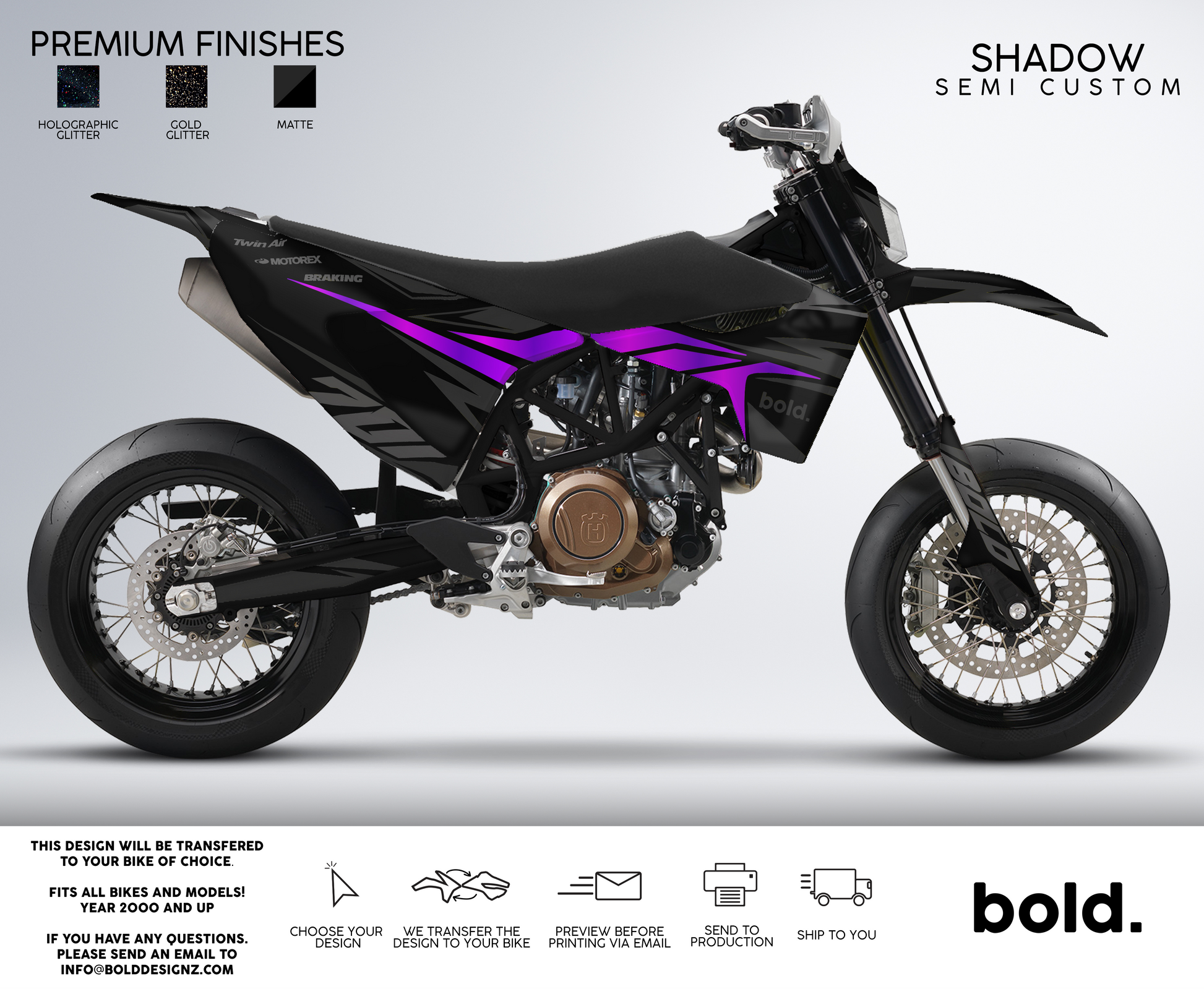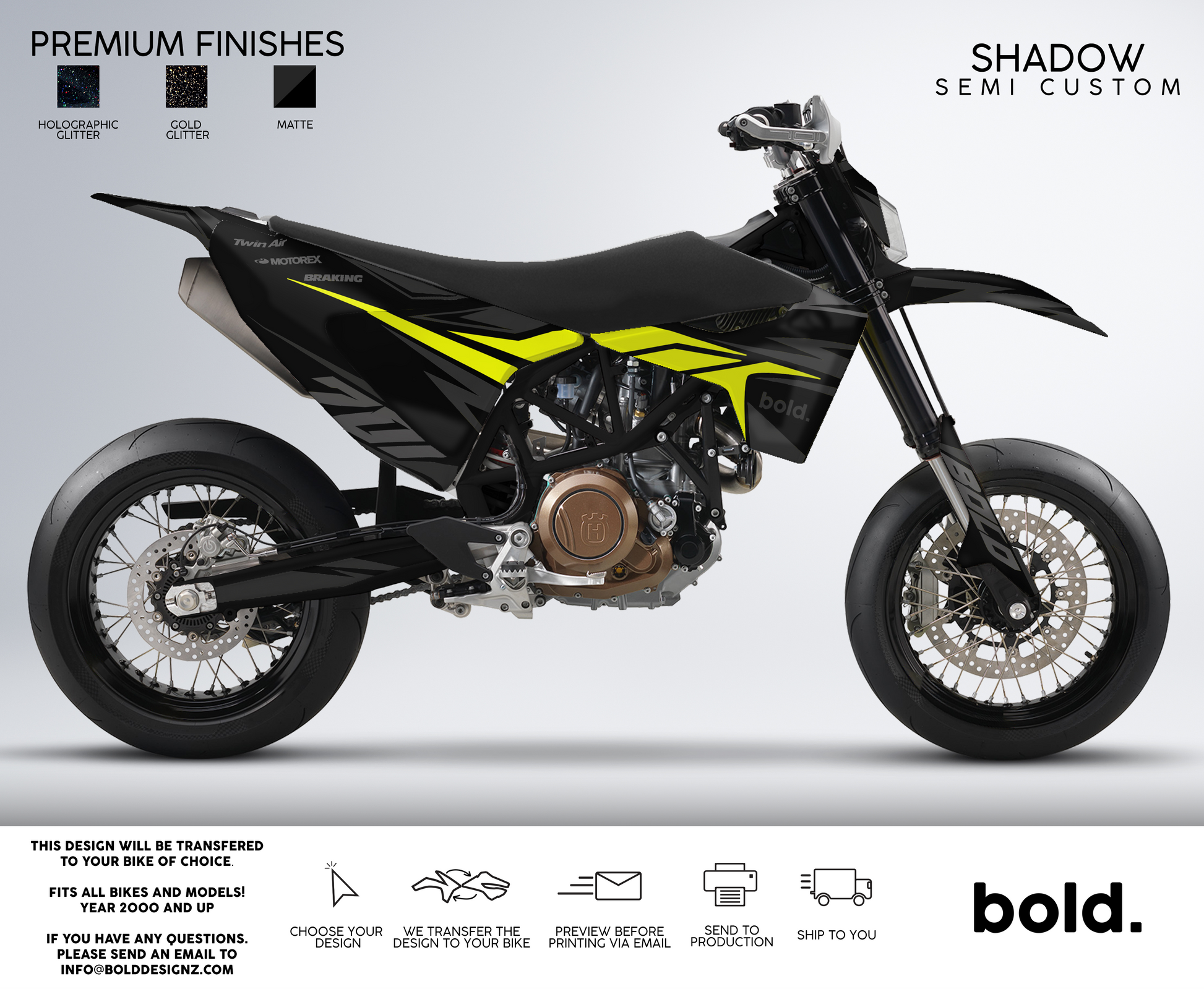 Your graphics will resist scratches, fading, and peeling, ensuring your bike maintains its head-turning looks for years to come. Don't settle for ordinary; embrace the extraordinary. Get your Bolddesignz Supermoto Semi-Custom Graphics and experience the thrill of riding a truly bold and unique bike.