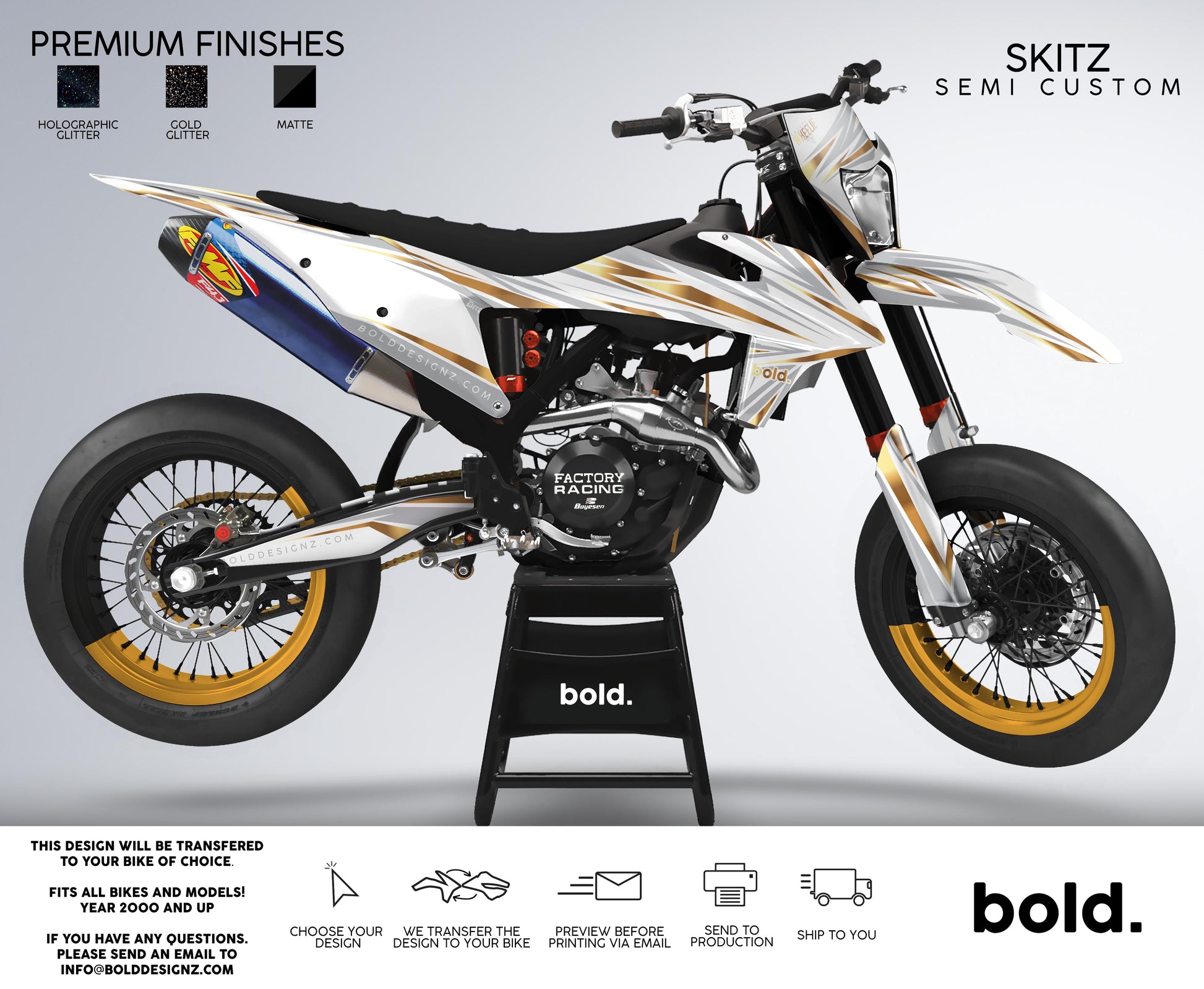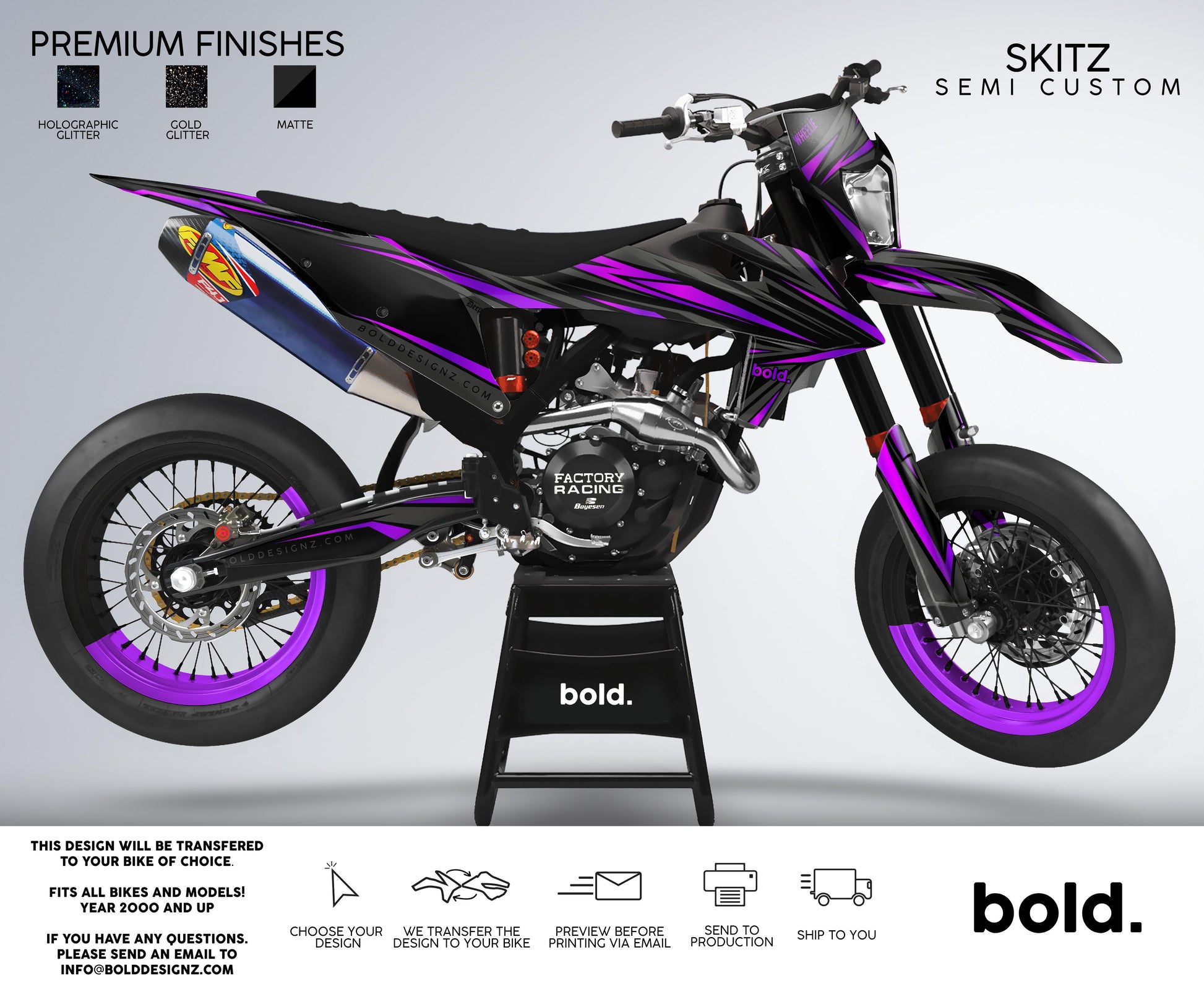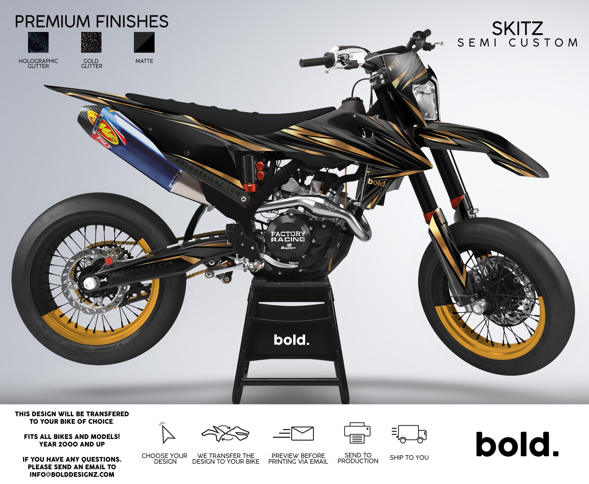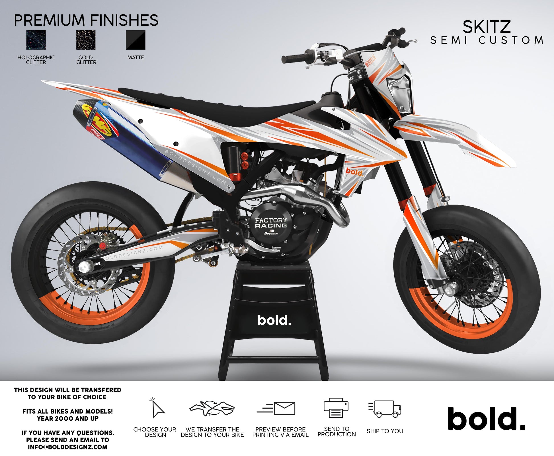 Your graphics will resist scratches, fading, and peeling, ensuring your bike maintains its head-turning looks for years to come. Don't settle for ordinary; embrace the extraordinary. Get your Bolddesignz Supermoto Semi-Custom Graphics and experience the thrill of riding a truly bold and unique bike.