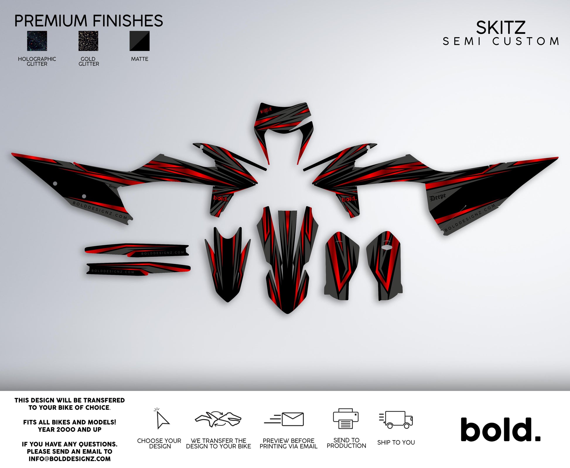 At Bolddesignz, the order process is designed to be easy, streamlined, and completely customized to ensure you get the perfect graphics for your bike. Every customer receives personal attention from a professional designer, making the experience smooth and enjoyable.