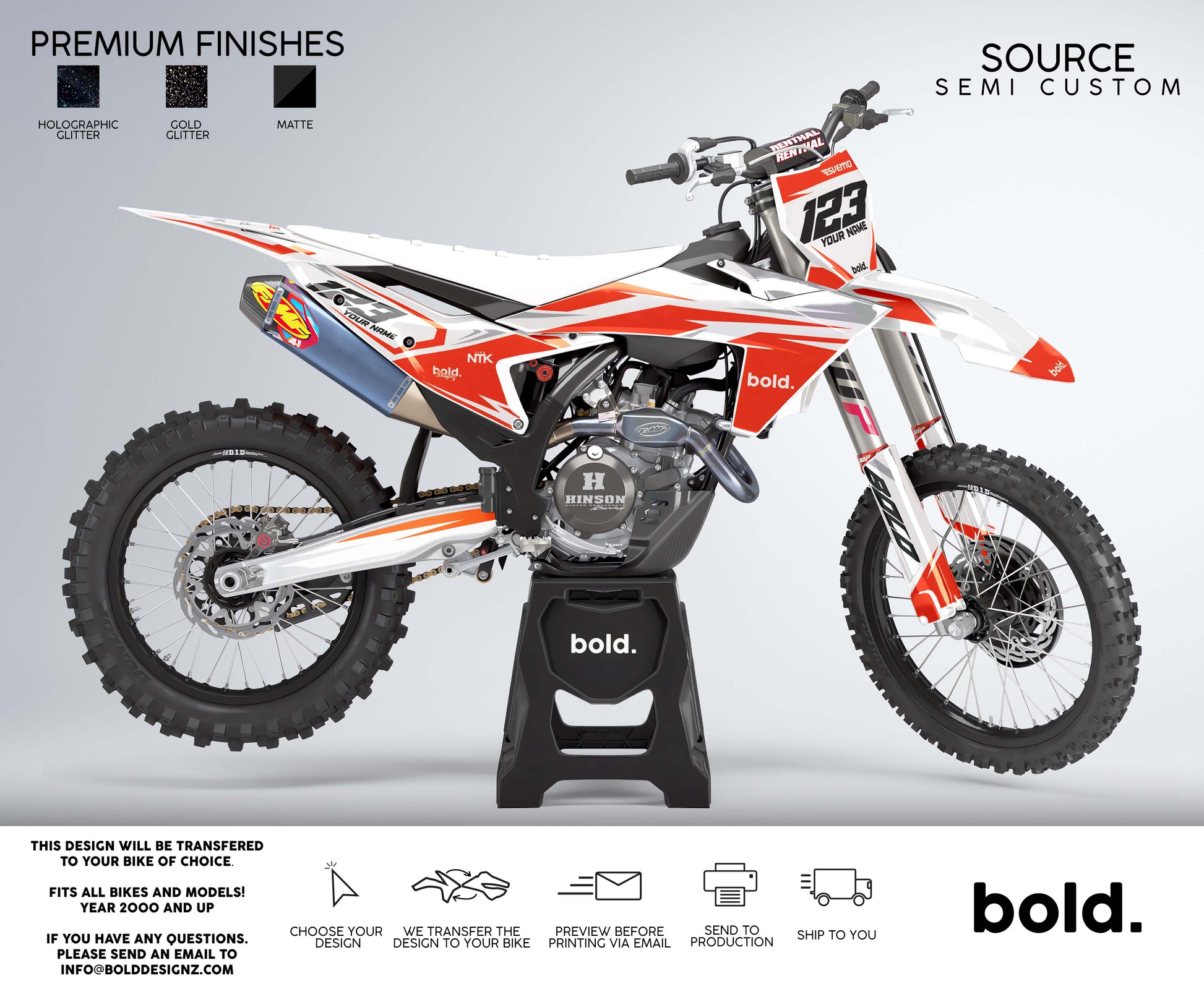 Your graphics will resist scratches, fading, and peeling, ensuring your dirt bike maintains its head-turning looks for years to come. Don't settle for ordinary; embrace the extraordinary. Get your Bolddesignz Motocross Semi Custom Graphics and experience the thrill of riding a truly bold and unique bike.