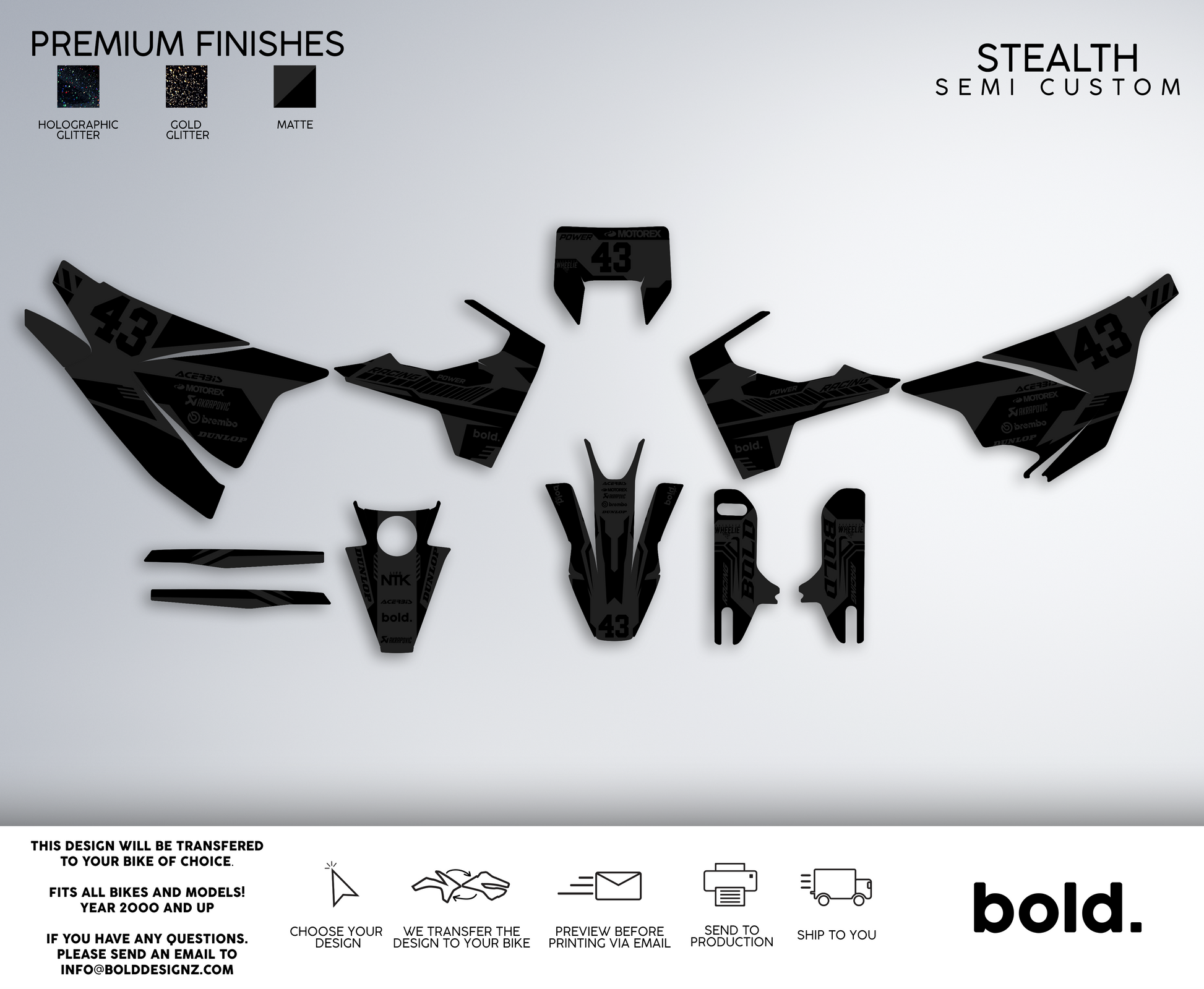 Your graphics will resist scratches, fading, and peeling, ensuring your bike maintains its head-turning looks for years to come. Don't settle for ordinary; embrace the extraordinary. Get your Bolddesignz Supermoto Semi-Custom Graphics and experience the thrill of riding a truly bold and unique bike.