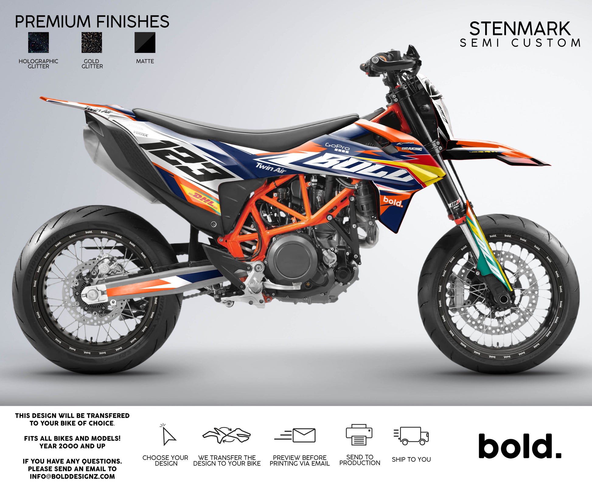 Your graphics will resist scratches, fading, and peeling, ensuring your bike maintains its head-turning looks for years to come. Don't settle for ordinary; embrace the extraordinary. Get your Bolddesignz Supermoto Semi-Custom Graphics and experience the thrill of riding a truly bold and unique bike.