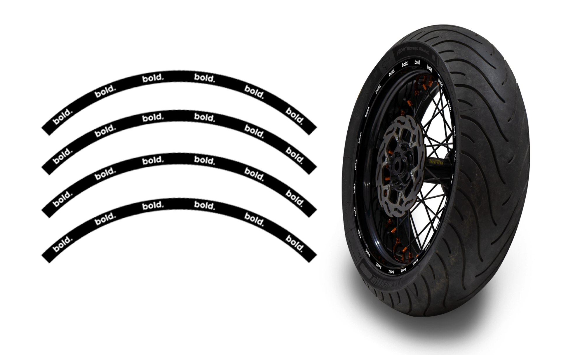 Complete your supermoto build by adding these custom made wheel stripes that match your kit.